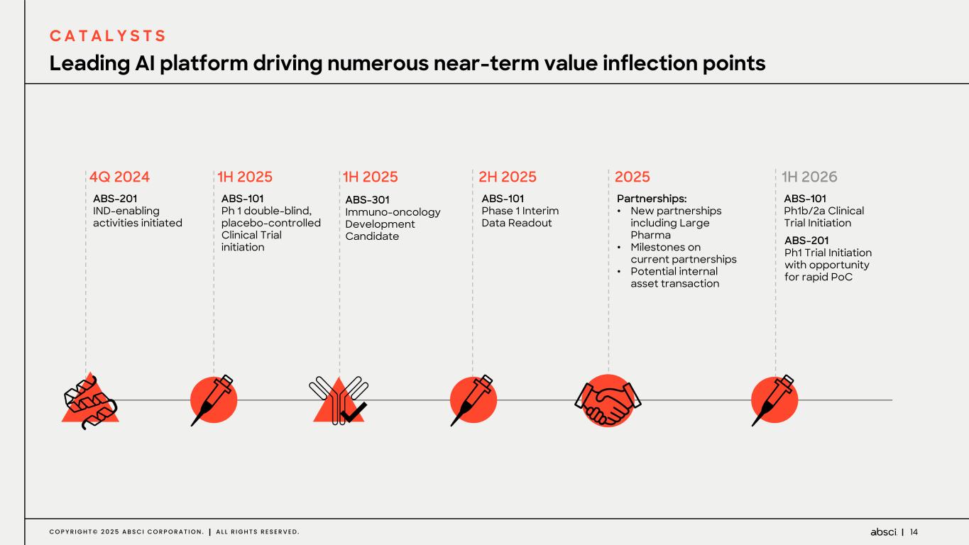 13C O P Y R I G H T © 2 0 2 5 A B S C I C O R P O R A T I O N . A L L R I G H T S R E S E R V E D . AI Drug Creation™ Partnerships Data & compute collaborations 25+ PARTNERED PROGRAMS SCALING COMPUTE 4 NAMED INTERNAL PROGRAMS ADDITIONAL PROGRAMS IN EARLY DEVELOPMENT IMPROVING MODELS INCREASING EFFICIENCIES Trademarks, service marks or trade names referred to herein are the intellectual property of their respective owners. Use of this IP does not imply affiliation, endorsement or sponsorship of any kind Driving Growth Through Industry-Leading Collaborations P A R T N E R S H I P S