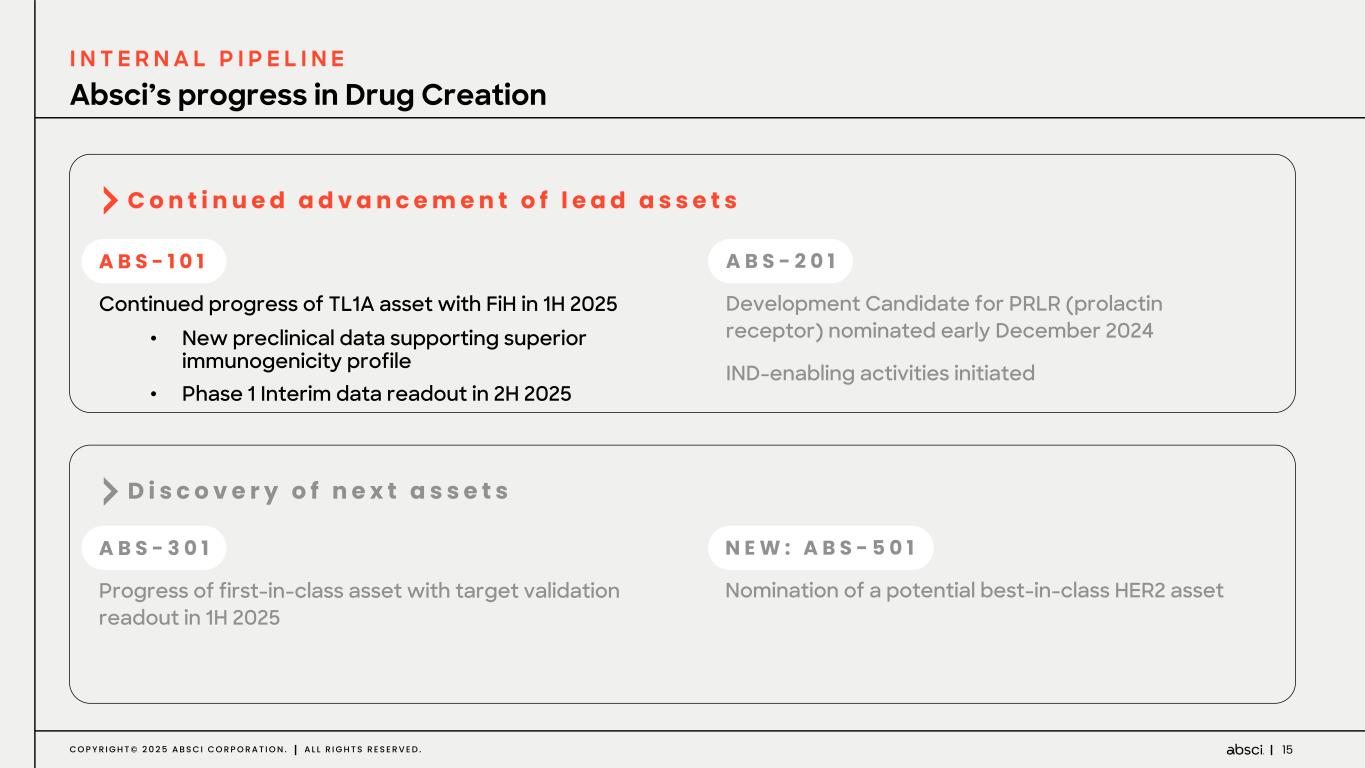 14C O P Y R I G H T © 2 0 2 5 A B S C I C O R P O R A T I O N . A L L R I G H T S R E S E R V E D . 1H 2025 2H 20251H 2025 Leading AI platform driving numerous near-term value inflection points ABS-101 Ph 1 double-blind, placebo-controlled Clinical Trial initiation ABS-101 Phase 1 Interim Data Readout ABS-201 IND-enabling activities initiated 4Q 2024 ABS-301 Immuno-oncology Development Candidate 2025 Partnerships: • New partnerships including Large Pharma • Milestones on current partnerships • Potential internal asset transaction 1H 2026 ABS-101 Ph1b/2a Clinical Trial Initiation ABS-201 Ph1 Trial Initiation with opportunity for rapid PoC C A T A L Y S T S