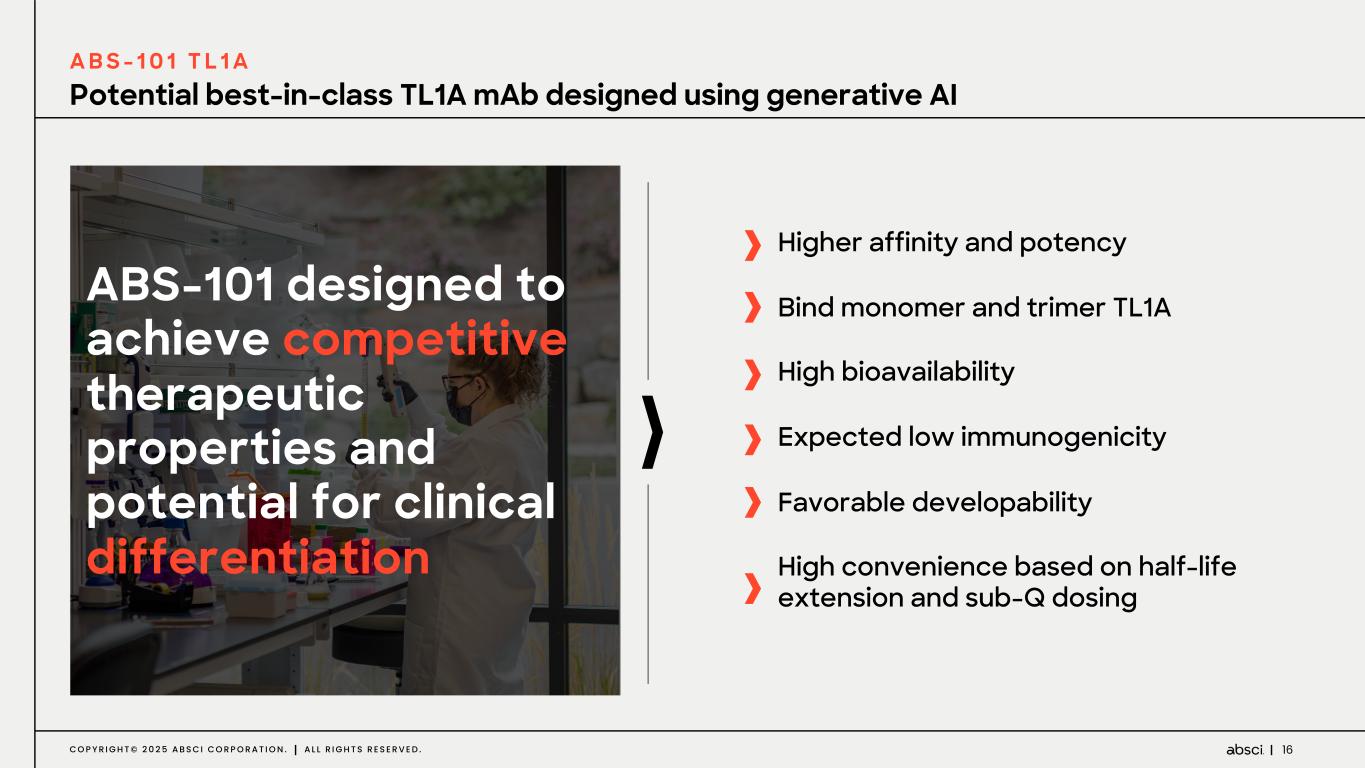 15C O P Y R I G H T © 2 0 2 5 A B S C I C O R P O R A T I O N . A L L R I G H T S R E S E R V E D . A B S - 1 0 1 Continued progress of TL1A asset with FiH in 1H 2025 • New preclinical data supporting superior immunogenicity profile • Phase 1 Interim data readout in 2H 2025 A B S - 2 0 1 Development Candidate for PRLR (prolactin receptor) nominated early December 2024 IND-enabling activities initiated A B S - 3 0 1 Progress of first-in-class asset with target validation readout in 1H 2025 N E W : A B S - 5 0 1 Nomination of a potential best-in-class HER2 asset C o n t i n u e d a d v a n c e m e n t o f l e a d a s s e t s D i s c o v e r y o f n e x t a s s e t s Absci’s progress in Drug Creation I N T E R N A L P I P E L I N E
