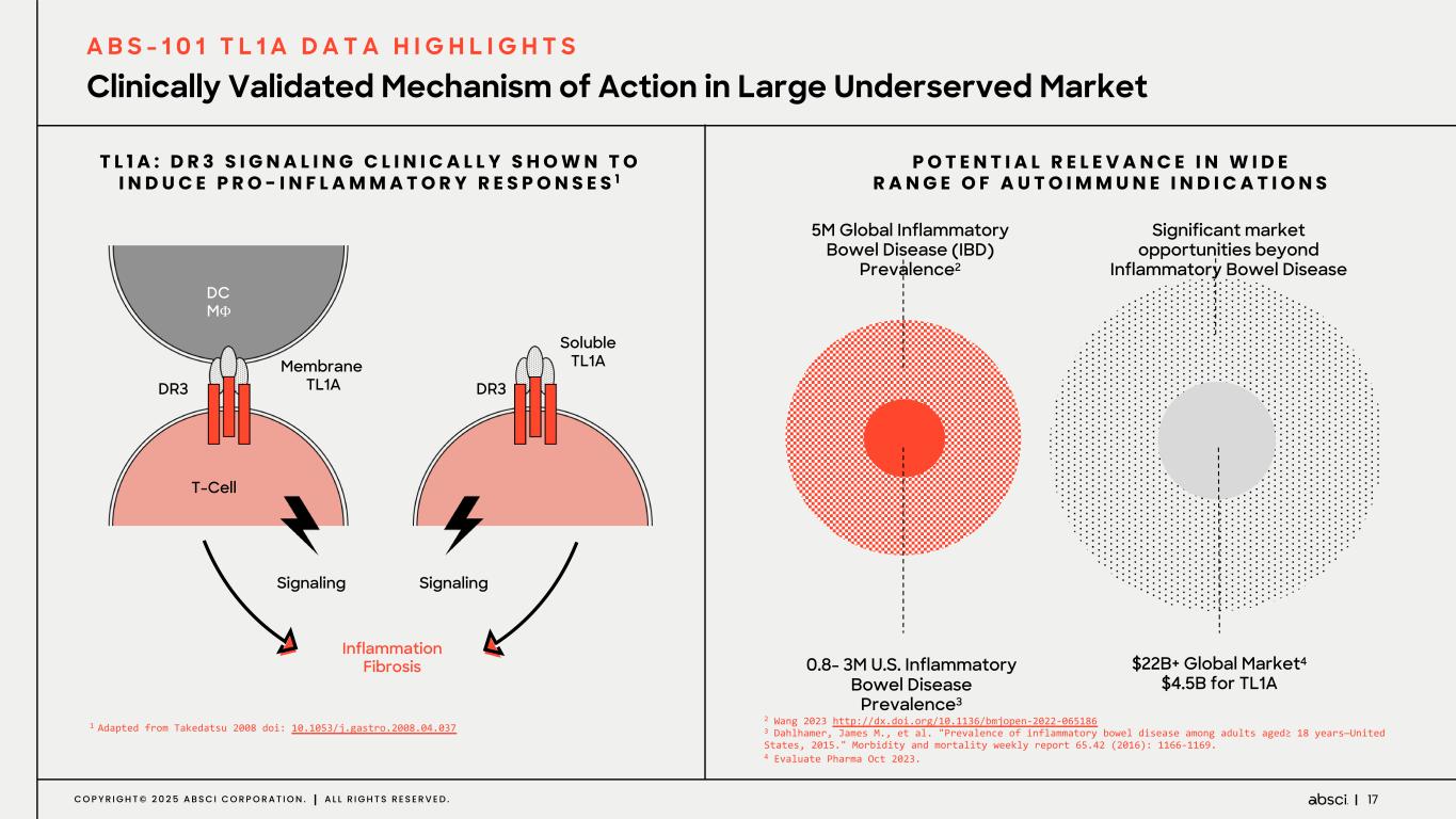 16C O P Y R I G H T © 2 0 2 5 A B S C I C O R P O R A T I O N . A L L R I G H T S R E S E R V E D . Potential best-in-class TL1A mAb designed using generative AI ABS-101 designed to achieve competitive therapeutic properties and potential for clinical differentiation A B S - 1 0 1 T L 1 A Higher affinity and potency Bind monomer and trimer TL1A High bioavailability Expected low immunogenicity Favorable developability High convenience based on half-life extension and sub-Q dosing