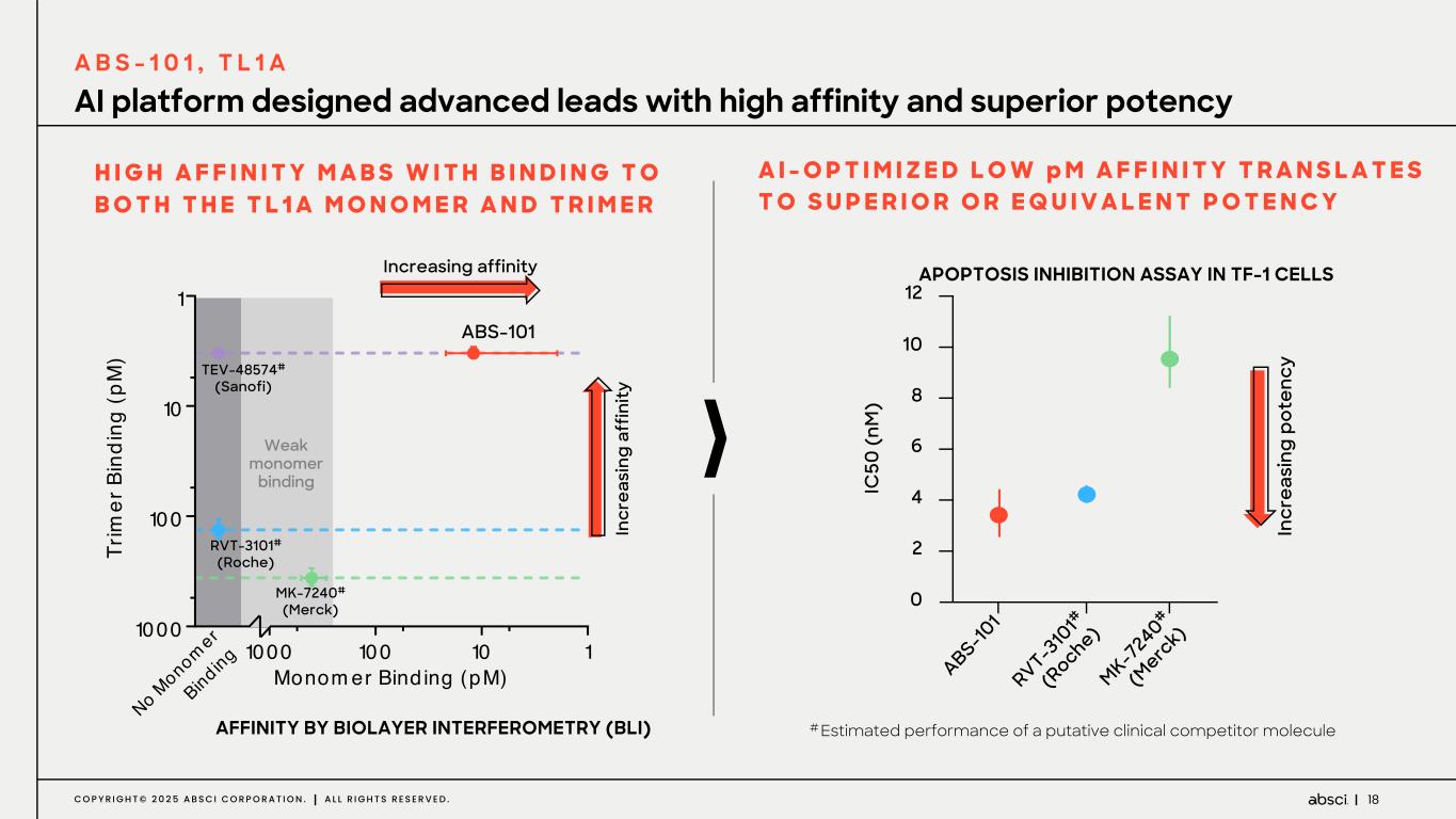 17C O P Y R I G H T © 2 0 2 5 A B S C I C O R P O R A T I O N . A L L R I G H T S R E S E R V E D . Inflammation Fibrosis Clinically Validated Mechanism of Action in Large Underserved Market A B S - 1 0 1 T L 1 A D A T A H I G H L I G H T S T L 1 A : D R 3 S I G N A L I N G C L I N I C A L L Y S H O W N T O I N D U C E P R O - I N F L A M M A T O R Y R E S P O N S E S 1 P O T E N T I A L R E L E V A N C E I N W I D E R A N G E O F A U T O I M M U N E I N D I C A T I O N S DC MΦ Membrane TL1ADR3 T-Cell Signaling Signaling DR3 Soluble TL1A 2 Wang 2023 http://dx.doi.org/10.1136/bmjopen-2022-065186 3 Dahlhamer, James M., et al. "Prevalence of inflammatory bowel disease among adults aged≥ 18 years—United States, 2015." Morbidity and mortality weekly report 65.42 (2016): 1166-1169. 4 Evaluate Pharma Oct 2023. 1 Adapted from Takedatsu 2008 doi: 10.1053/j.gastro.2008.04.037 Significant market opportunities beyond Inflammatory Bowel Disease $22B+ Global Market4 $4.5B for TL1A 0.8- 3M U.S. Inflammatory Bowel Disease Prevalence3 5M Global Inflammatory Bowel Disease (IBD) Prevalence2