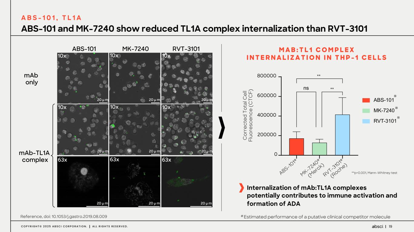 18C O P Y R I G H T © 2 0 2 5 A B S C I C O R P O R A T I O N . A L L R I G H T S R E S E R V E D . H I G H A F F I N I T Y M A B S W I T H B I N D I N G T O B O T H T H E T L 1 A M O N O M E R A N D T R I M E R A I - O P T I M I Z E D L O W p M A F F I N I T Y T R A N S L A T E S T O S U P E R I O R O R E Q U I V A L E N T P O T E N C Y # Estimated performance of a putative clinical competitor molecule In cr ea si ng p ot en cy IC 50 (n M ) 0 2 4 6 8 10 12 ABS-10 1 RVT-3 10 1# (R oche) MK-7 240 # (M erc k) APOPTOSIS INHIBITION ASSAY IN TF-1 CELLS AFFINITY BY BIOLAYER INTERFEROMETRY (BLI) AI platform designed advanced leads with high affinity and superior potency A B S - 1 0 1 , T L 1 A Increasing affinity In cr ea si ng a ff in ity 1101001000 1 10 100 1000 Monom er Bind ing (pM) Tr im er B in di ng (p M ) No M onomer Bind ing Weak monomer binding ABS-101 RVT-3101# (Roche) MK-7240# (Merck) TEV-48574# (Sanofi)