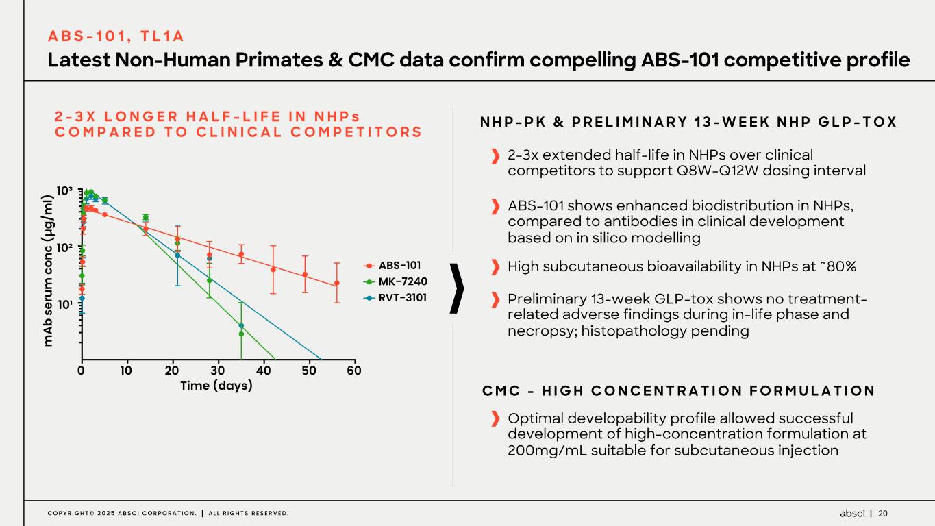 19C O P Y R I G H T © 2 0 2 5 A B S C I C O R P O R A T I O N . A L L R I G H T S R E S E R V E D . ABS-101 and MK-7240 show reduced TL1A complex internalization than RVT-3101 A B S - 1 0 1 , T L 1 A mAb only ABS-101 RVT-3101MK-7240 10x 10x 10x 10x 10x 10x 63x 63x 63x 20 µ m 20 µ m 20 µ m 20 µ m 20 µ m 20 µ m 20 µ m 20 µ m 20 µ m mAb-TL1A complex M A B : T L 1 C O M P L E X I N T E R N A L I Z A T I O N I N T H P - 1 C E L L S Internalization of mAb:TL1A complexes potentially contributes to immune activation and formation of ADA **p<0.001, Mann-Whitney test Reference, doi: 10.1053/j.gastro.2019.08.009 # # # 0 200000 400000 600000 800000 ABS-101 MK-7240 RVT-3101 ns ** ** C or re ct ed T ot al C el l Fl uo re sc en ce ( C TC F) # Estimated performance of a putative clinical competitor molecule ABS-10 1# MK-7240# (M erck) RVT-310 1# (R oche)