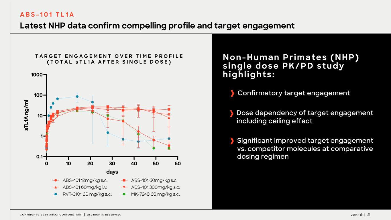 20C O P Y R I G H T © 2 0 2 5 A B S C I C O R P O R A T I O N . A L L R I G H T S R E S E R V E D . Latest Non-Human Primates & CMC data confirm compelling ABS-101 competitive profile A B S - 1 0 1 , T L 1 A 2-3x extended half-life in NHPs over clinical competitors to support Q8W-Q12W dosing interval ABS-101 shows enhanced biodistribution in NHPs, compared to antibodies in clinical development based on in silico modelling Optimal developability profile allowed successful development of high-concentration formulation at 200mg/mL suitable for subcutaneous injection C M C - H I G H C O N C E N T R A T I O N F O R M U L A T I O N 2 - 3 X L O N G E R H A L F - L I F E I N N H P s C O M P A R E D T O C L I N I C A L C O M P E T I T O R S m A b se ru m c on c (µ g/ m l) Time (days) 0 10 20 30 40 50 60 10¹ 10² 10³ ABS-101 MK-7240 RVT-3101 Preliminary 13-week GLP-tox shows no treatment- related adverse findings during in-life phase and necropsy; histopathology pending High subcutaneous bioavailability in NHPs at ~80% N H P - P K & P R E L I M I N A R Y 1 3 - W E E K N H P G L P - T O X