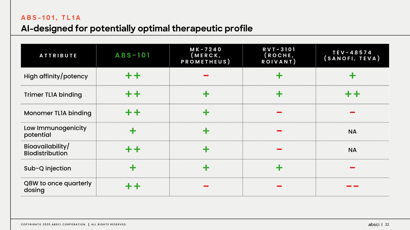 21C O P Y R I G H T © 2 0 2 5 A B S C I C O R P O R A T I O N . A L L R I G H T S R E S E R V E D . Latest NHP data confirm compelling profile and target engagement Confirmatory target engagement N o n - H u m a n P r i m a t e s ( N H P ) s i n g l e d o s e P K / P D s t u d y h i g h l i g h t s : Significant improved target engagement vs. competitor molecules at comparative dosing regimen Dose dependency of target engagement including ceiling effect T A R G E T E N G A G E M E N T O V E R T I M E P R O F I L E ( T O T A L s T L 1 A A F T E R S I N G L E D O S E ) A B S - 1 0 1 T L 1 A