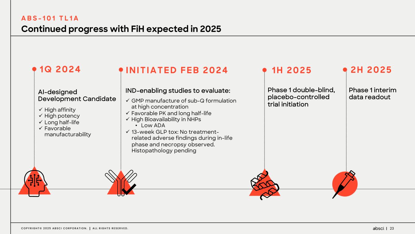 22C O P Y R I G H T © 2 0 2 5 A B S C I C O R P O R A T I O N . A L L R I G H T S R E S E R V E D . AI-designed for potentially optimal therapeutic profile A B S - 1 0 1 , T L 1 A A T T R I B U T E ABS - 1 0 1 M K - 7 2 4 0 ( M E R C K , P R O M E T H E U S ) R V T - 3 1 0 1 ( R O C H E , R O I V A N T ) T E V - 4 8 5 7 4 ( S A N O F I , T E V A ) High affinity/potency ++ - + + Trimer TL1A binding ++ + + ++ Monomer TL1A binding ++ + - - Low Immunogenicity potential + + - NA Bioavailability/ Biodistribution ++ + - NA Sub-Q injection + + + - Q8W to once quarterly dosing ++ - - --