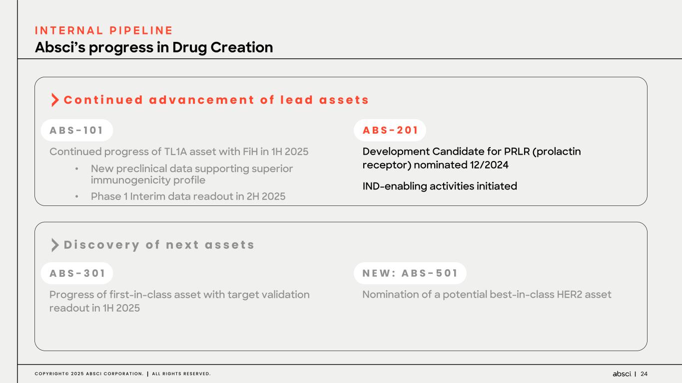23C O P Y R I G H T © 2 0 2 5 A B S C I C O R P O R A T I O N . A L L R I G H T S R E S E R V E D . Continued progress with FiH expected in 2025 A B S - 1 0 1 T L 1 A AI-designed Development Candidate ü High affinity ü High potency ü Long half-life ü Favorable manufacturability 1 Q 2 0 2 4 I N I T I A T E D F E B 2 0 2 4 1 H 2 0 2 5 IND-enabling studies to evaluate: ü GMP manufacture of sub-Q formulation at high concentration ü Favorable PK and long half-life ü High Bioavailability in NHPs • Low ADA ü 13-week GLP tox: No treatment- related adverse findings during in-life phase and necropsy observed. Histopathology pending Phase 1 double-blind, placebo-controlled trial initiation Phase 1 interim data readout 2 H 2 0 2 5
