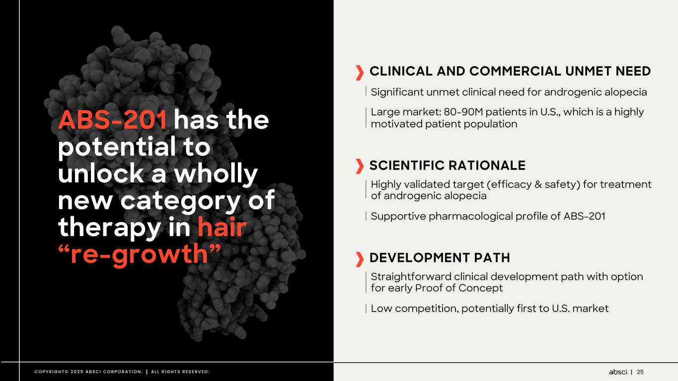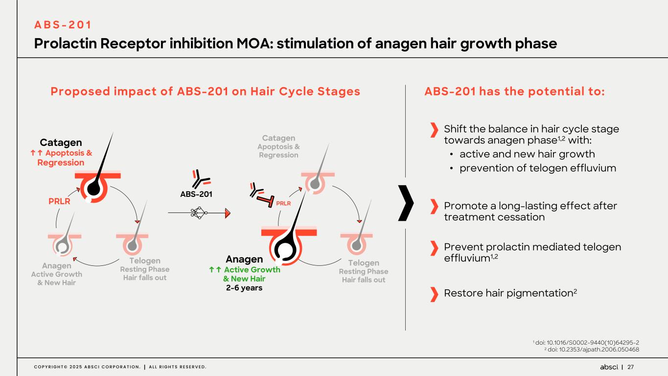 26C O P Y R I G H T © 2 0 2 5 A B S C I C O R P O R A T I O N . A L L R I G H T S R E S E R V E D . Significant underserved patient population looking for therapeutic innovation FEMALE ANDROGENIC ALOPECIA ~30M women in U.S. Only 1 FDA approved therapy for women ~50M men in the U.S. Only 2 FDA approved therapies 80 - 90 MILLION AMERICANS LIVE WITH ANDROGENIC ALOPECIA MALE ANDROGENIC ALPOPECIA Growing patient population with limited therapeutic options and side-effect concerns Last FDA approved therapy for androgenic alopecia was in the 1990s Patients and clinicians need better treatment options for “hair re-growth” Hair re-growth, not just slowing of hair loss Safe and minimal side effects Durable effect Convenient administration frequency FDA approved A B S - 2 0 1