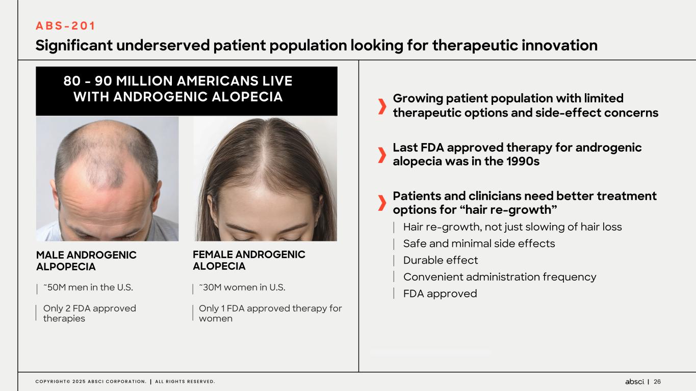 25C O P Y R I G H T © 2 0 2 5 A B S C I C O R P O R A T I O N . A L L R I G H T S R E S E R V E D . ABS-201 has the potential to unlock a wholly new category of therapy in hair “re-growth” Significant unmet clinical need for androgenic alopecia Large market: 80-90M patients in U.S., which is a highly motivated patient population CLINICAL AND COMMERCIAL UNMET NEED Straightforward clinical development path with option for early Proof of Concept Low competition, potentially first to U.S. market DEVELOPMENT PATH Highly validated target (efficacy & safety) for treatment of androgenic alopecia Supportive pharmacological profile of ABS-201 SCIENTIFIC RATIONALE