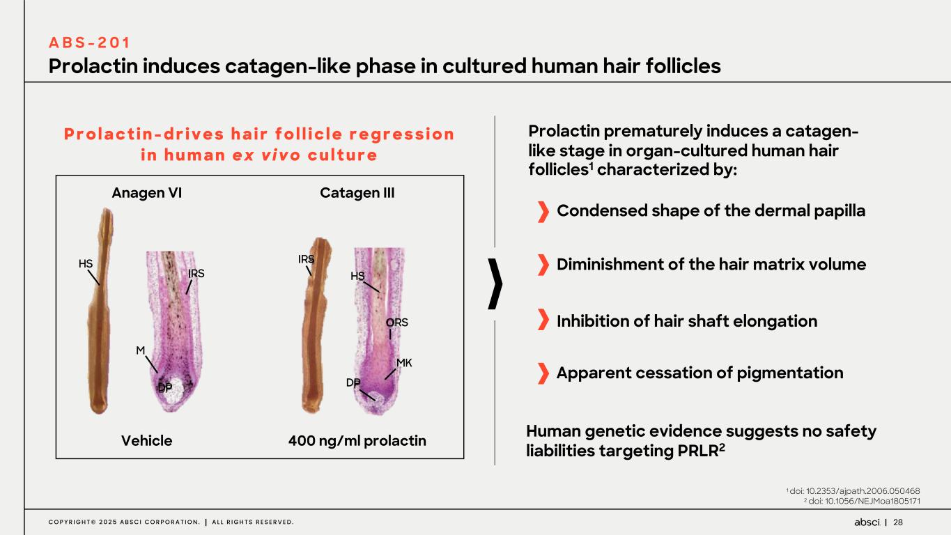27C O P Y R I G H T © 2 0 2 5 A B S C I C O R P O R A T I O N . A L L R I G H T S R E S E R V E D . Prolactin Receptor inhibition MOA: stimulation of anagen hair growth phase Proposed impact of ABS-201 on Hair Cycle Stages ABS-201 has the potential to: Catagen ↑↑ Apoptosis & Regression Telogen Resting Phase Hair falls out PRLR Anagen Active Growth & New Hair ABS-201 Anagen ↑↑ Active Growth & New Hair 2-6 years Telogen Resting Phase Hair falls out PRLR Catagen Apoptosis & Regression Shift the balance in hair cycle stage towards anagen phase1,2 with: • active and new hair growth • prevention of telogen effluvium Restore hair pigmentation2 Promote a long-lasting effect after treatment cessation 1 doi: 10.1016/S0002-9440(10)64295-2 2 doi: 10.2353/ajpath.2006.050468 Prevent prolactin mediated telogen effluvium1,2 A B S - 2 0 1