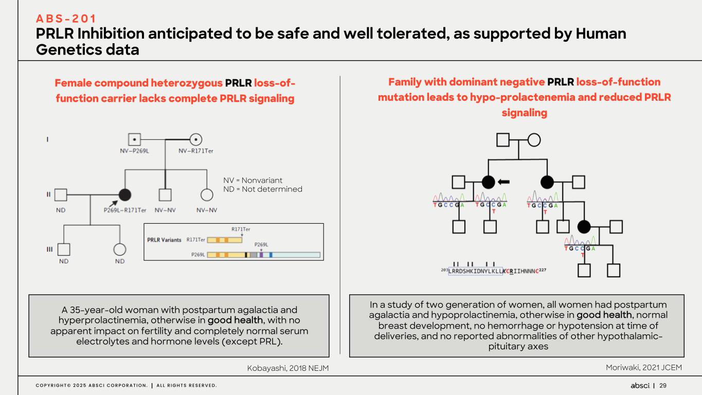 29C O P Y R I G H T © 2 0 2 5 A B S C I C O R P O R A T I O N . A L L R I G H T S R E S E R V E D . Kobayashi, 2018 NEJM Female compound heterozygous PRLR loss-of- function carrier lacks complete PRLR signaling A 35-year-old woman with postpartum agalactia and hyperprolactinemia, otherwise in good health, with no apparent impact on fertility and completely normal serum electrolytes and hormone levels (except PRL). NV = Nonvariant ND = Not determined Family with dominant negative PRLR loss-of-function mutation leads to hypo-prolactenemia and reduced PRLR signaling In a study of two generation of women, all women had postpartum agalactia and hypoprolactinemia, otherwise in good health, normal breast development, no hemorrhage or hypotension at time of deliveries, and no reported abnormalities of other hypothalamic- pituitary axes Moriwaki, 2021 JCEM PRLR Inhibition anticipated to be safe and well tolerated, as supported by Human Genetics data A B S - 2 0 1