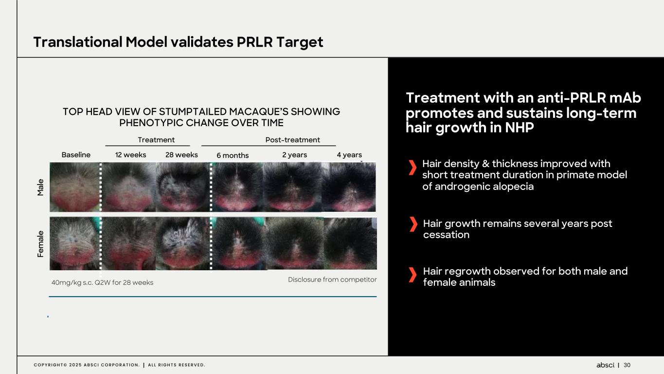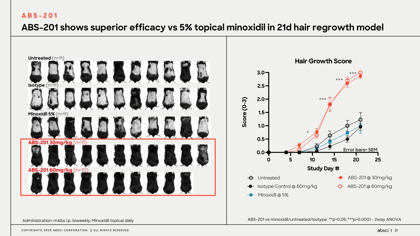 30C O P Y R I G H T © 2 0 2 5 A B S C I C O R P O R A T I O N . A L L R I G H T S R E S E R V E D . Treatment with an anti-PRLR mAb promotes and sustains long-term hair growth in NHP TOP HEAD VIEW OF STUMPTAILED MACAQUE’S SHOWING PHENOTYPIC CHANGE OVER TIME 40mg/kg s.c. Q2W for 28 weeks Disclosure from competitor Hair density & thickness improved with short treatment duration in primate model of androgenic alopecia Hair growth remains several years post cessation Hair regrowth observed for both male and female animals M al e Fe m al e Baseline 12 weeks 28 weeks 6 months 2 years 4 years Post-treatmentTreatment Translational Model validates PRLR Target