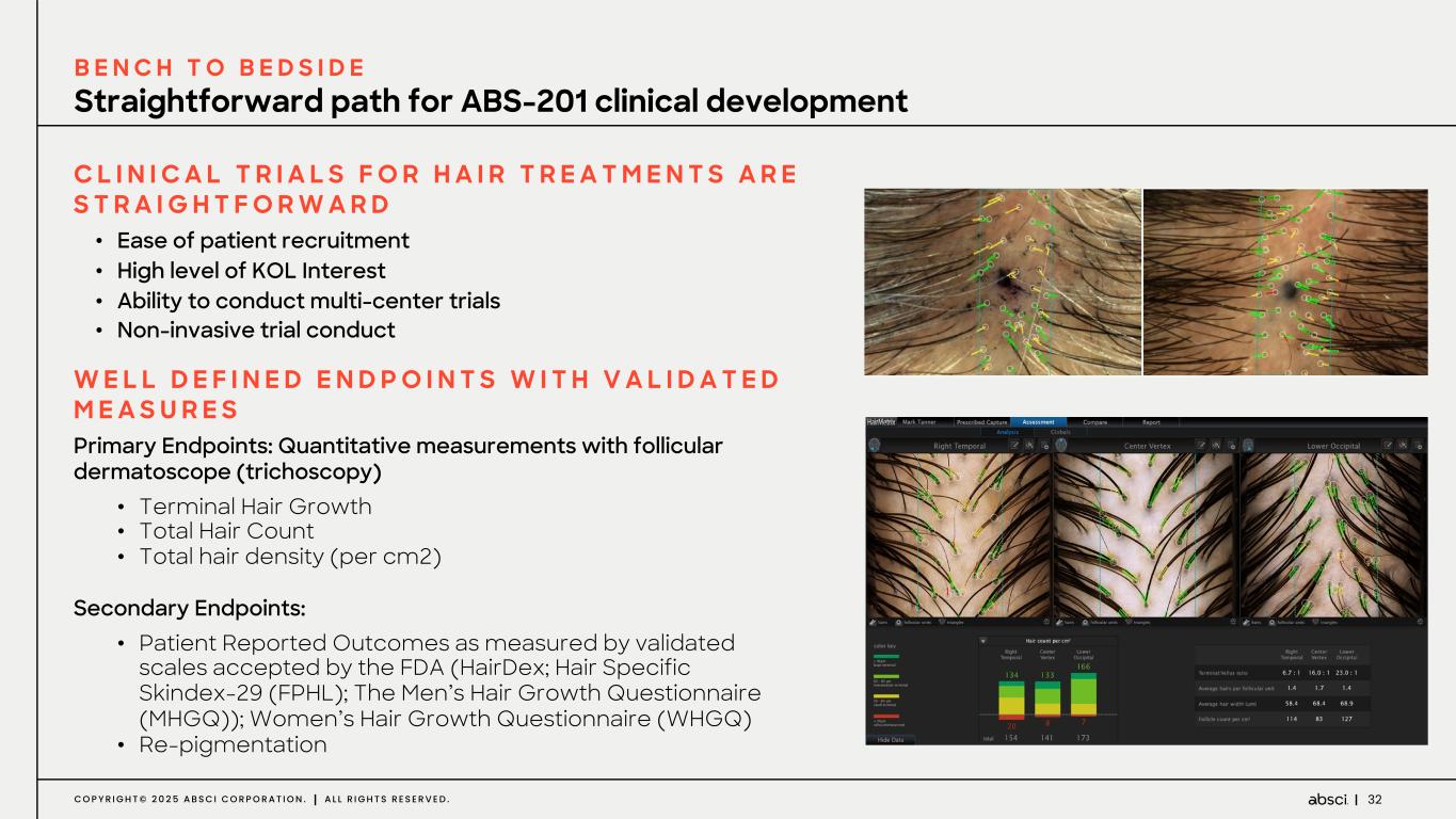 31C O P Y R I G H T © 2 0 2 5 A B S C I C O R P O R A T I O N . A L L R I G H T S R E S E R V E D . ABS-201 shows superior efficacy vs 5% topical minoxidil in 21d hair regrowth model Administration: mAbs i.p. biweekly; Minoxidil topical daily Untreated (n=11) Isotype (n=11) Minoxidil 5% (n=11) ABS-201 30mg/kg (n=11) ABS-201 60mg/kg (n=10) ABS-201 vs minoxidil/untreated/isotype **p<0.05; ***p<0.0001 - 2way ANOVA Error bars= SEM *** *** *** * A B S - 2 0 1