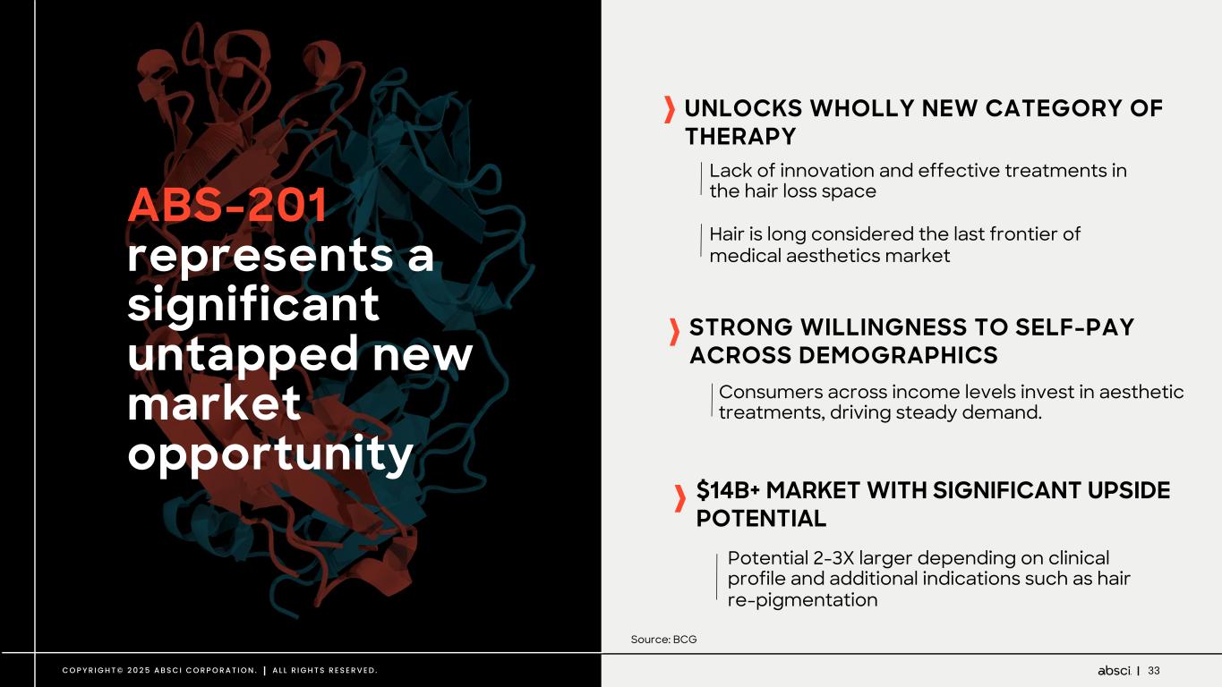 32C O P Y R I G H T © 2 0 2 5 A B S C I C O R P O R A T I O N . A L L R I G H T S R E S E R V E D . Straightforward path for ABS-201 clinical development C L I N I C A L T R I A L S F O R H A I R T R E A T M E N T S A R E S T R A I G H T F O R W A R D • Ease of patient recruitment • High level of KOL Interest • Ability to conduct multi-center trials • Non-invasive trial conduct W E L L D E F I N E D E N D P O I N T S W I T H V A L I D A T E D M E A S U R E S Primary Endpoints: Quantitative measurements with follicular dermatoscope (trichoscopy) • Terminal Hair Growth • Total Hair Count • Total hair density (per cm2) Secondary Endpoints: • Patient Reported Outcomes as measured by validated scales accepted by the FDA (HairDex; Hair Specific Skindex-29 (FPHL); The Men’s Hair Growth Questionnaire (MHGQ)); Women’s Hair Growth Questionnaire (WHGQ) • Re-pigmentation B E N C H T O B E D S I D E