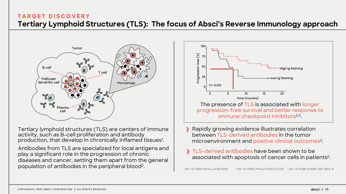 35C O P Y R I G H T © 2 0 2 5 A B S C I C O R P O R A T I O N . A L L R I G H T S R E S E R V E D . The presence of TLS is associated with longer progression-free survival and better response to immune checkpoint inhibitors2,3. Rapidly growing evidence illustrates correlation between TLS-derived antibodies in the tumor microenvironment and positive clinical outcomes2. TLS-derived antibodies have been shown to be associated with apoptosis of cancer cells in patients2. Tertiary lymphoid structures (TLS) are centers of immune activity, such as B-cell proliferation and antibody production, that develop in chronically inflamed tissues1. Antibodies from TLS are specialized for local antigens and play a significant role in the progression of chronic diseases and cancer, setting them apart from the general population of antibodies in the peripheral blood2. 100 75 50 25 10 15 20 0 0 5 High Ig Staining Low Ig Staining Pr og re ss io n- fr ee ( % ) Time (months) P= 0.019 Tertiary Lymphoid Structures (TLS): The focus of Absci’s Reverse Immunology approach T A R G E T D I S C O V E R Y 1 doi: 10.3389/fimmu.2018.01952 2 doi: 10.1016/j.immuni.2022.02.001 3 doi: 10.1038/s41586-019-1922-8