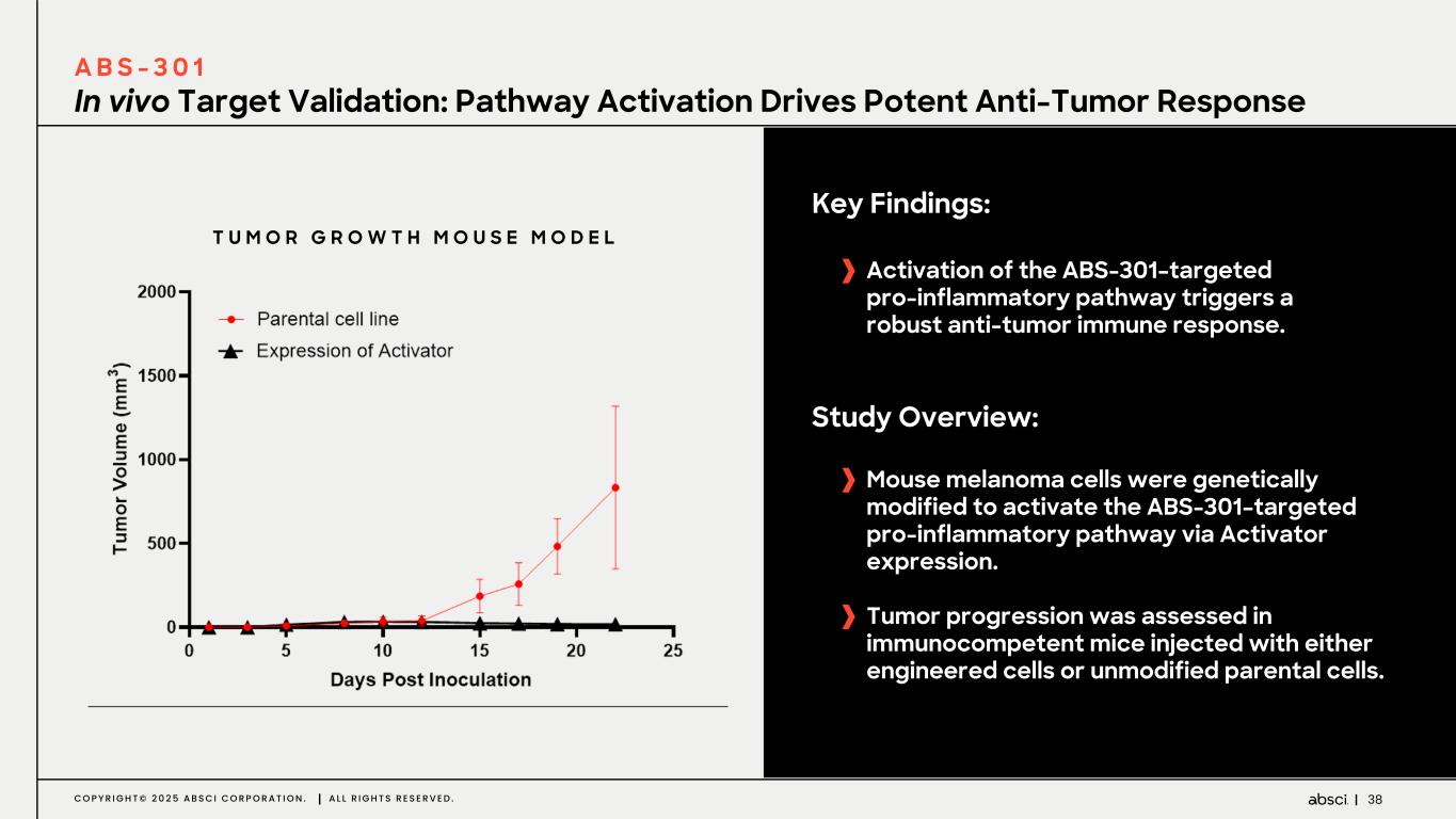 38C O P Y R I G H T © 2 0 2 5 A B S C I C O R P O R A T I O N . A L L R I G H T S R E S E R V E D . In vivo Target Validation: Pathway Activation Drives Potent Anti-Tumor Response A B S - 3 0 1 Key Findings: Activation of the ABS-301–targeted pro-inflammatory pathway triggers a robust anti-tumor immune response. Study Overview: Mouse melanoma cells were genetically modified to activate the ABS-301–targeted pro-inflammatory pathway via Activator expression. Tumor progression was assessed in immunocompetent mice injected with either engineered cells or unmodified parental cells. T U M O R G R O W T H M O U S E M O D E L