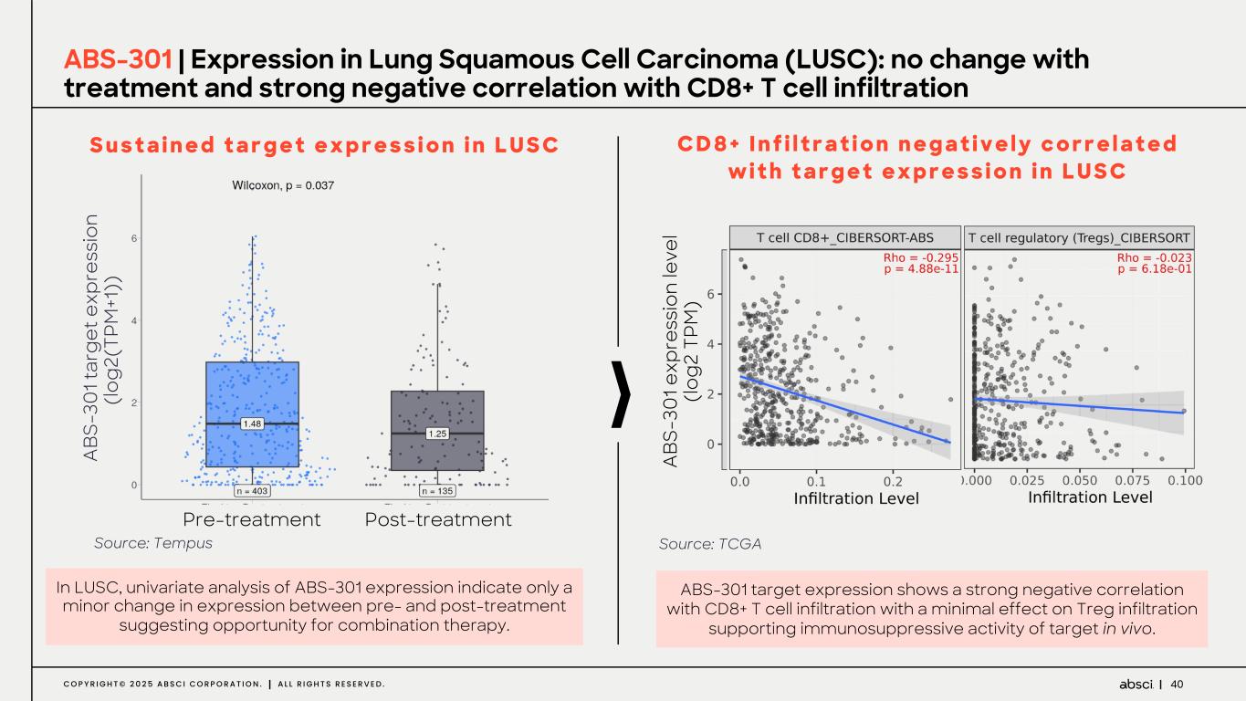 40C O P Y R I G H T © 2 0 2 5 A B S C I C O R P O R A T I O N . A L L R I G H T S R E S E R V E D . ABS-301 | Expression in Lung Squamous Cell Carcinoma (LUSC): no change with treatment and strong negative correlation with CD8+ T cell infiltration In LUSC, univariate analysis of ABS-301 expression indicate only a minor change in expression between pre- and post-treatment suggesting opportunity for combination therapy. S u s t a i n e d t a r g e t e x p r e s s i o n i n L U S C ABS-301 target expression shows a strong negative correlation with CD8+ T cell infiltration with a minimal effect on Treg infiltration supporting immunosuppressive activity of target in vivo. C D 8 + I n f i l t r a t i o n n e g a t i v e l y c o r r e l a t e d w i t h t a r g e t e x p r e s s i o n i n L U S C Source: Tempus Source: TCGA Pre-treatment Post-treatment A BS -3 01 ta rg et e xp re ss io n (lo g2 (T PM +1 )) A BS -3 01 e xp re ss io n le ve l (lo g2 T PM )