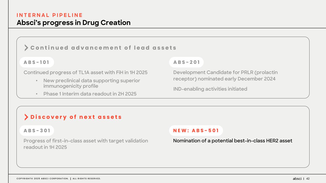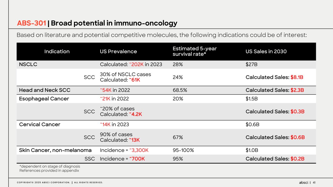 41C O P Y R I G H T © 2 0 2 5 A B S C I C O R P O R A T I O N . A L L R I G H T S R E S E R V E D . ABS-301 | Broad potential in immuno-oncology Based on literature and potential competitive molecules, the following indications could be of interest: *dependent on stage of diagnosis References provided in appendix Indication US Prevalence Estimated 5-year survival rate* US Sales in 2030 NSCLC Calculated: ~202K in 2023 28% $27B SCC 30% of NSCLC cases Calculated: ~61K 24% Calculated Sales: $8.1B Head and Neck SCC ~54K in 2022 68.5% Calculated Sales: $2.3B Esophageal Cancer ~21K in 2022 20% $1.5B SCC ~20% of cases Calculated: ~4.2K Calculated Sales: $0.3B Cervical Cancer ~14K in 2023 $0.6B SCC 90% of cases Calculated: ~13K 67% Calculated Sales: $0.6B Skin Cancer, non-melanoma Incidence = ~3,300K 95-100% $1.0B SSC Incidence = ~700K 95% Calculated Sales: $0.2B