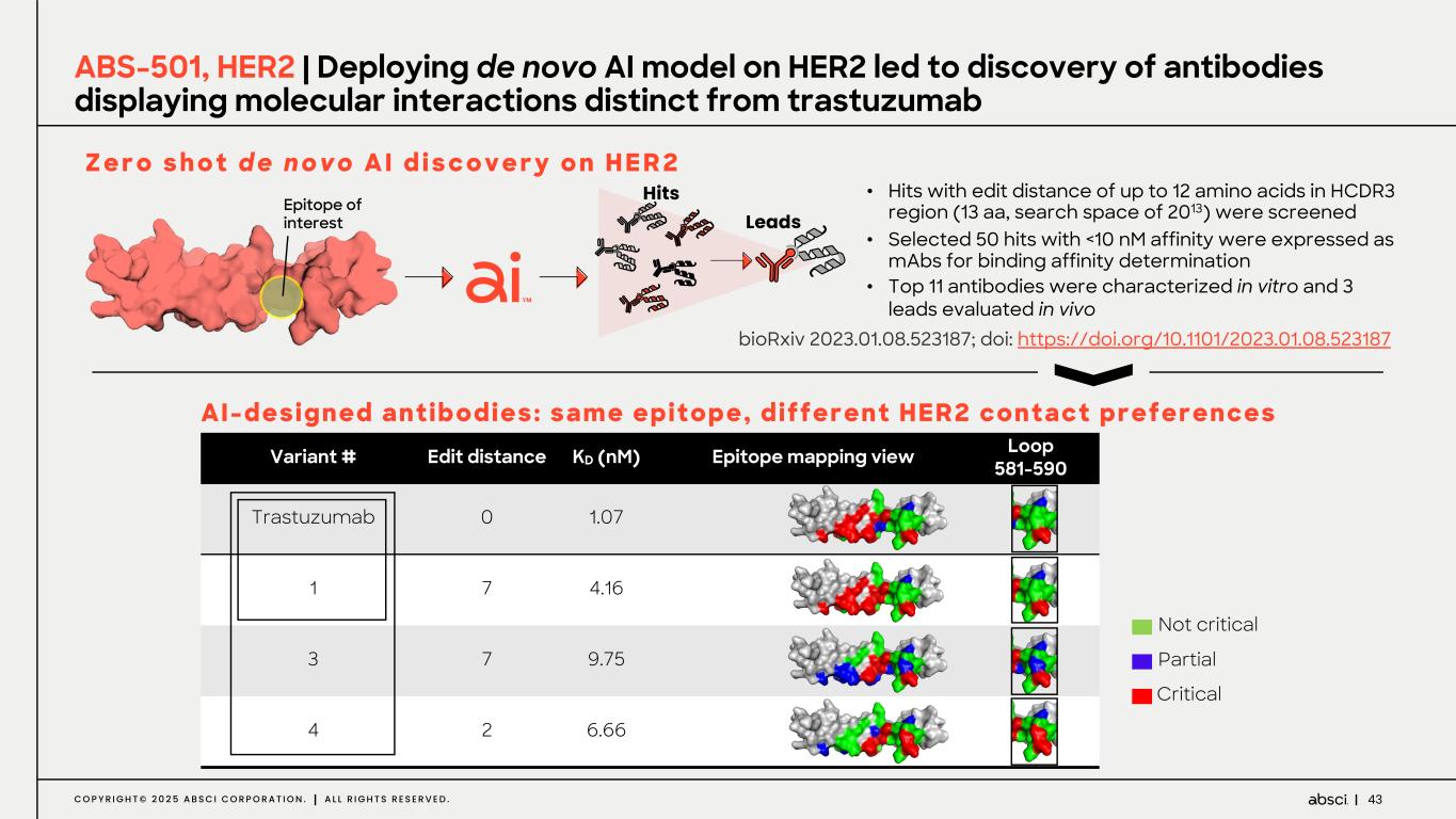 43C O P Y R I G H T © 2 0 2 5 A B S C I C O R P O R A T I O N . A L L R I G H T S R E S E R V E D . • Hits with edit distance of up to 12 amino acids in HCDR3 region (13 aa, search space of 2013) were screened • Selected 50 hits with <10 nM affinity were expressed as mAbs for binding affinity determination • Top 11 antibodies were characterized in vitro and 3 leads evaluated in vivo ABS-501, HER2 | Deploying de novo AI model on HER2 led to discovery of antibodies displaying molecular interactions distinct from trastuzumab Variant # Edit distance KD (nM) Epitope mapping view Loop 581-590 Trastuzumab 0 1.07 1 7 4.16 3 7 9.75 4 2 6.66 Partial Critical Not critical Z e r o s h o t d e n o v o A I d i s c o v e r y o n H E R 2 AI-designed antibodies: same epitope, different HER2 contact preferences Epitope of interest Hits Leads bioRxiv 2023.01.08.523187; doi: https://doi.org/10.1101/2023.01.08.523187