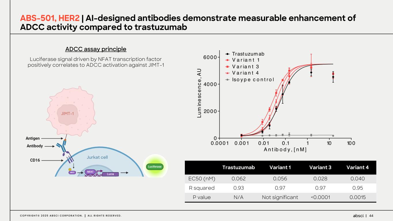 44C O P Y R I G H T © 2 0 2 5 A B S C I C O R P O R A T I O N . A L L R I G H T S R E S E R V E D . Luciferase signal driven by NFAT transcription factor positively correlates to ADCC activation against JIMT-1 ABS-501, HER2 | AI-designed antibodies demonstrate measurable enhancement of ADCC activity compared to trastuzumab ADCC assay principle Trastuzumab Variant 1 Variant 3 Variant 4 EC50 (nM) 0.062 0.056 0.028 0.040 R squared 0.93 0.97 0.97 0.95 P value N/A Not significant <0.0001 0.0015 0 .0001 0 .001 0 .01 0 .1 1 10 100 0 2000 4000 6000 A n t ib o d y , [ n M ] Lu m in es ce nc e, A U Trastuzum ab V a r ia n t 1 V a r ia n t 3 V a r ia n t 4 Iso y p e c o n t r o l JIMT-1 Jurkat cell