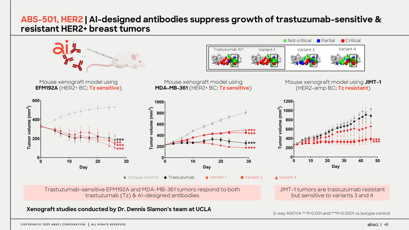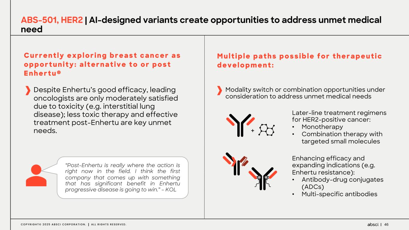 45C O P Y R I G H T © 2 0 2 5 A B S C I C O R P O R A T I O N . A L L R I G H T S R E S E R V E D . ABS-501, HER2 | AI-designed antibodies suppress growth of trastuzumab-sensitive & resistant HER2+ breast tumors Partial Critical Not critical Trastuzumab WT Variant 1 Variant 3 Variant 4 Mouse xenograft model using EFM192A (HER2+ BC; Tz sensitive) Mouse xenograft model using JIMT-1 (HER2-amp BC; Tz resistant) Trastuzumab-sensitive EFM192A and MDA-MB-361 tumors respond to both trastuzumab (Tz) & AI-designed antibodies Xenograft studies conducted by Dr. Dennis Slamon’s team at UCLA Isotype control Trastuzumab Variant 1 Variant 3 Variant 4 ! "! #! $! ! #!! %!! &!! D() *+ , -. /0 -1 +, 2/ 3, , $ 4 ! "! #! $! %! &! ! #!! %!! D!! (!! "!!! "#!! )*+ ,- . /0 12 /3 -. 41 5. . $ 6 *** ****** *** *** Mouse xenograft model using MDA-MB-361 (HER2+ BC; Tz sensitive) ! "! #! $! ! #!! %!! &!! D!! "!!! ()* +, - ./ 01 .2 ,- 30 4- - $ 5 *** *** ****** 2-way ANOVA ** P<0.001 and ***P<0.0001 vs isotype control JIMT-1 tumors are trastuzumab resistant but sensitive to variants 3 and 4 **