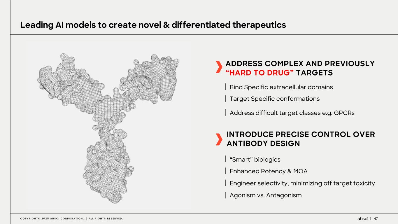 47C O P Y R I G H T © 2 0 2 5 A B S C I C O R P O R A T I O N . A L L R I G H T S R E S E R V E D . Leading AI models to create novel & differentiated therapeutics “Smart” biologics Enhanced Potency & MOA Engineer selectivity, minimizing off target toxicity Agonism vs. Antagonism Bind Specific extracellular domains Target Specific conformations Address difficult target classes e.g. GPCRs ADDRESS COMPLEX AND PREVIOUSLY “HARD TO DRUG” TARGETS INTRODUCE PRECISE CONTROL OVER ANTIBODY DESIGN