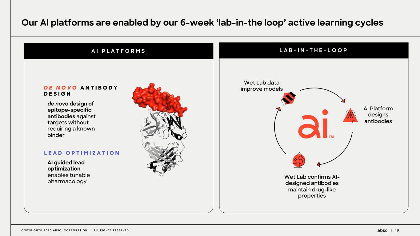 48C O P Y R I G H T © 2 0 2 5 A B S C I C O R P O R A T I O N . A L L R I G H T S R E S E R V E D . Leadership in AI de novo design of antibody-based therapeutics EVQLSEVGA . . . de novo antibody design model creates epitope-specific binders given a target structure Designed in framework of choice or multiple frameworks INPUT EMBEDDING STRUCTURE PREDICTION (DIFFUSION) . . . ARCPSIWKFPDEEGACQPC . . . Antigen Structure/Sequence (Epitope) PROTEIN LANGUAGE MODELS Co-optimization enables improvement of antibody attributes while maintaining developability Precise engineering of molecule pharmacology AI LEAD OPTIMIZATIONDE NOVO ANTIBODY DESIGN
