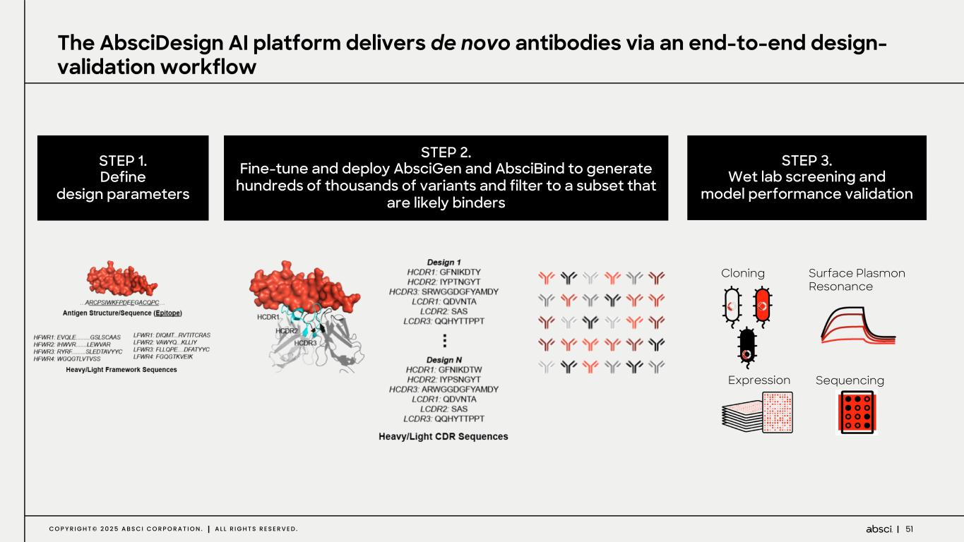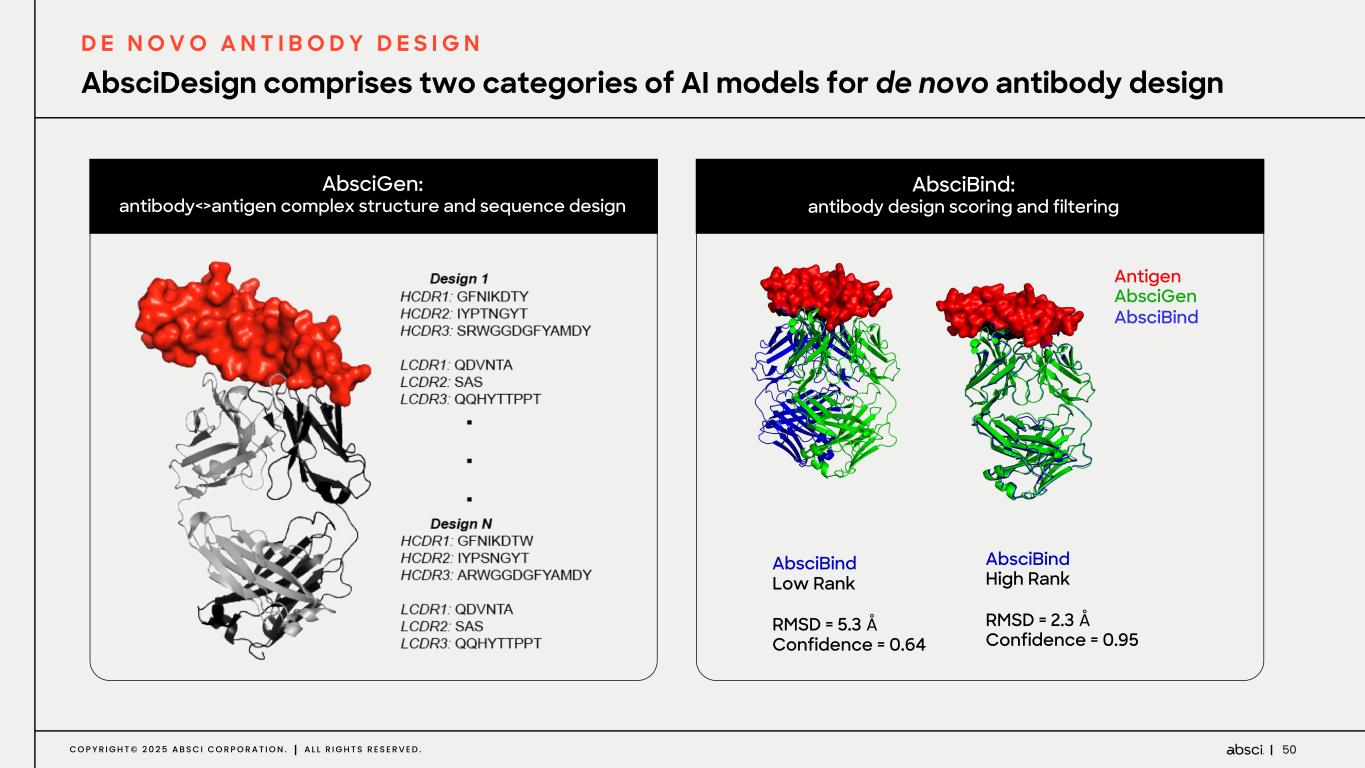 49C O P Y R I G H T © 2 0 2 5 A B S C I C O R P O R A T I O N . A L L R I G H T S R E S E R V E D . AI Platform designs antibodies Wet Lab confirms AI- designed antibodies maintain drug-like properties Wet Lab data improve models D E N O V O A N T I B O D Y D E S I G N Our AI platforms are enabled by our 6-week ‘lab-in-the loop’ active learning cycles A I P L A T F O R M S L A B - I N - T H E - L O O P L E A D O P T I M I Z A T I O N AI guided lead optimization enables tunable pharmacology de novo design of epitope-specific antibodies against targets without requiring a known binder