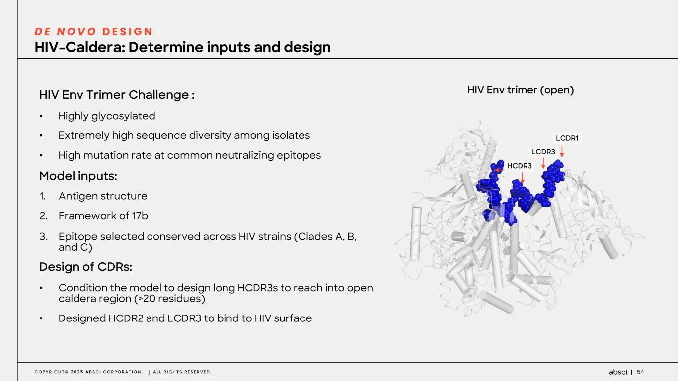 53C O P Y R I G H T © 2 0 2 5 A B S C I C O R P O R A T I O N . A L L R I G H T S R E S E R V E D . No natural or synthetic antibody for HIV exists today because immune system cannot derive an antibody that is universally neutralizing against HIV Design challenge: create universally neutralizing HIV antibody by binding unique and conserved epitope within “caldera” of open conformation of gp120 to prevent HIV from entering host cells Numerous attempts to target this epitope have failed-previous efforts have identified antibodies, but none bind the “caldera” and none are universally neutralizing. de novo design antibody that binds to the highly conserved caldera region of HIV gp120 D E N O V O D E S I G N 17b epitope Caldera HIV gp120 trimer (open)