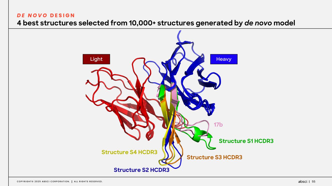 55C O P Y R I G H T © 2 0 2 5 A B S C I C O R P O R A T I O N . A L L R I G H T S R E S E R V E D . 4 best structures selected from 10,000+ structures generated by de novo model D E N O V O D E S I G N 17b Structure S1 HCDR3 Structure S3 HCDR3 Structure S2 HCDR3 Structure S4 HCDR3 HeavyLight
