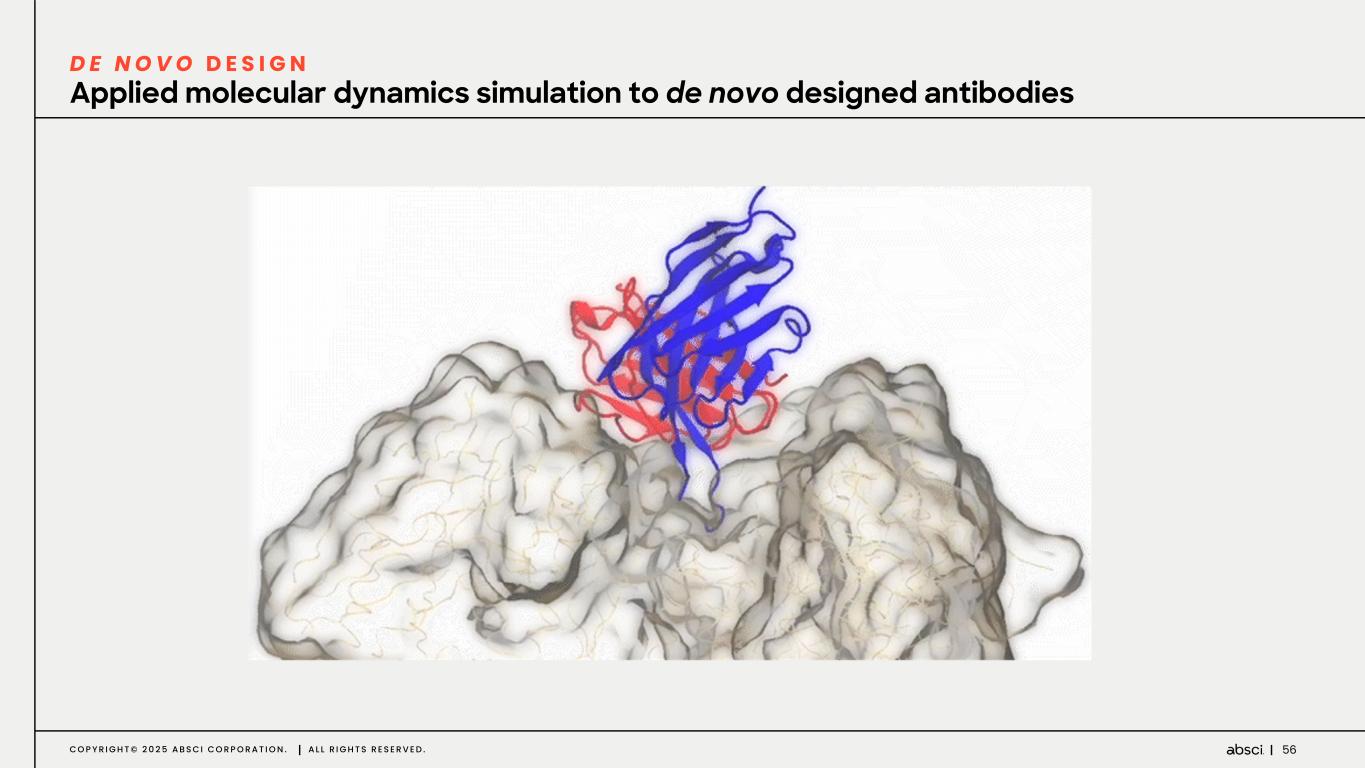 56C O P Y R I G H T © 2 0 2 5 A B S C I C O R P O R A T I O N . A L L R I G H T S R E S E R V E D . Applied molecular dynamics simulation to de novo designed antibodies D E N O V O D E S I G N
