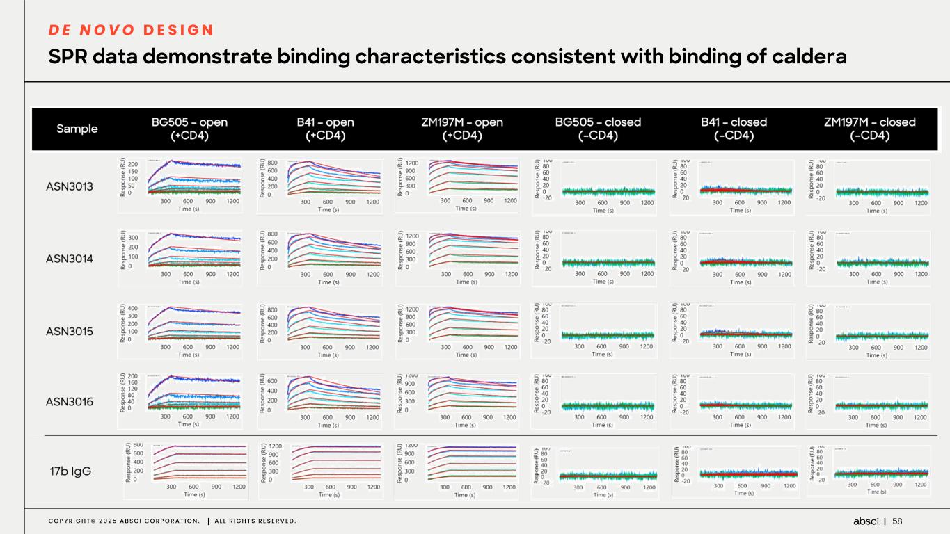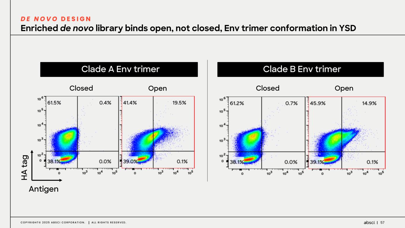 57C O P Y R I G H T © 2 0 2 5 A B S C I C O R P O R A T I O N . A L L R I G H T S R E S E R V E D . H A ta g Antigen Clade A Env trimer Closed Open Enriched de novo library binds open, not closed, Env trimer conformation in YSD D E N O V O D E S I G N Closed Open Clade B Env trimer