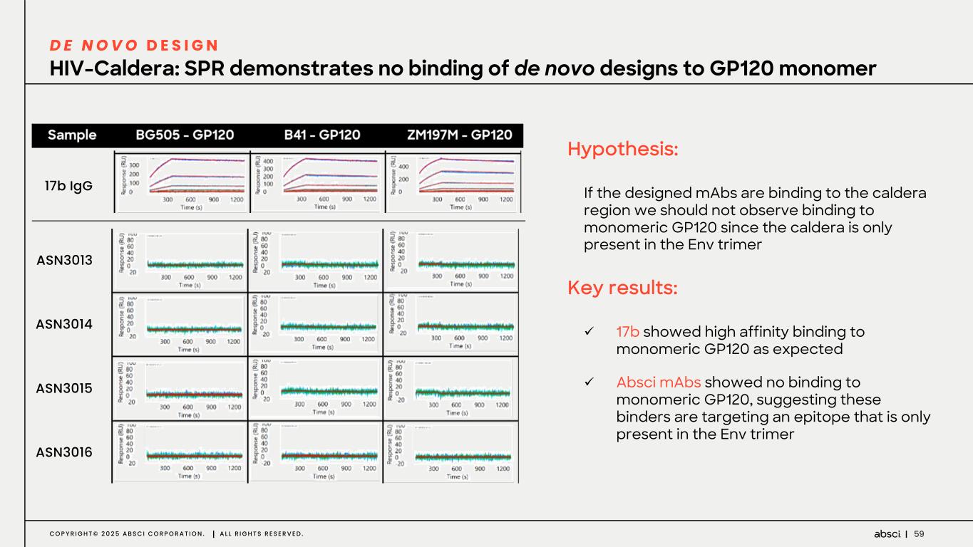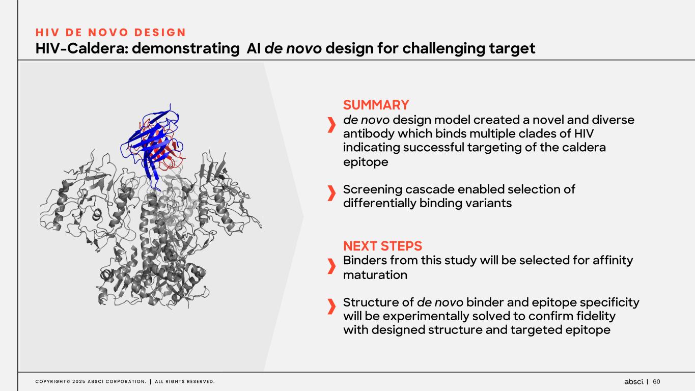 59C O P Y R I G H T © 2 0 2 5 A B S C I C O R P O R A T I O N . A L L R I G H T S R E S E R V E D . HIV-Caldera: SPR demonstrates no binding of de novo designs to GP120 monomer D E N O V O D E S I G N Hypothesis: If the designed mAbs are binding to the caldera region we should not observe binding to monomeric GP120 since the caldera is only present in the Env trimer Key results: ü 17b showed high affinity binding to monomeric GP120 as expected ü Absci mAbs showed no binding to monomeric GP120, suggesting these binders are targeting an epitope that is only present in the Env trimer ASN3013 ASN3014 ASN3015 ASN3016 17b IgG