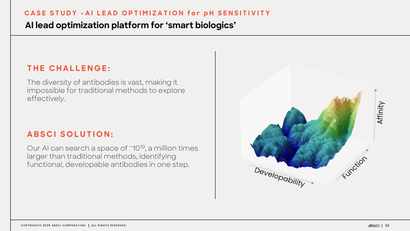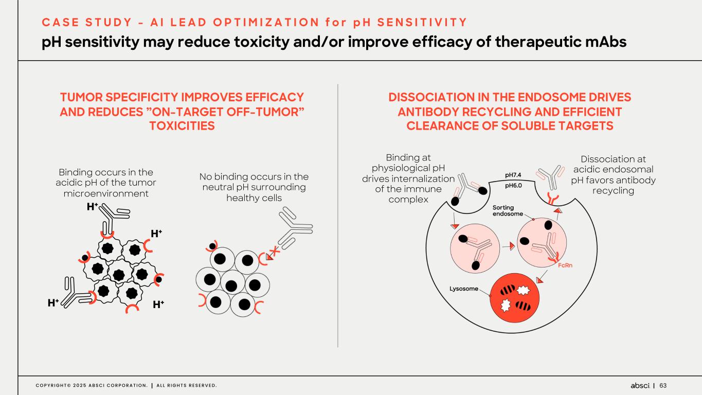 62C O P Y R I G H T © 2 0 2 5 A B S C I C O R P O R A T I O N . A L L R I G H T S R E S E R V E D . C A S E S T U D Y – A I L E A D O P T I M I Z A T I O N f o r p H S E N S I T I V I T Y AI lead optimization platform for ‘smart biologics’ T H E C H A L L E N G E : The diversity of antibodies is vast, making it impossible for traditional methods to explore effectively. A B S C I S O L U T I O N : Our AI can search a space of ~1019, a million times larger than traditional methods, identifying functional, developable antibodies in one step.
