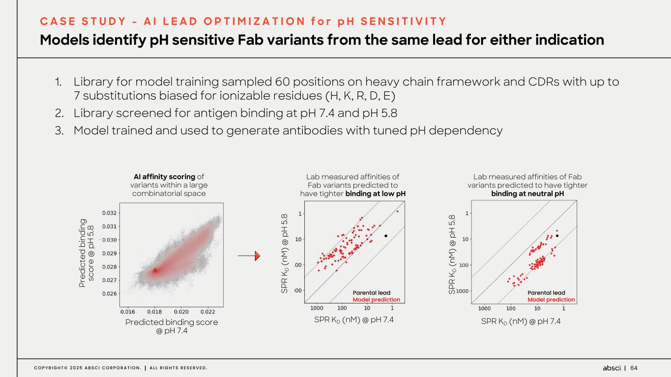 63C O P Y R I G H T © 2 0 2 5 A B S C I C O R P O R A T I O N . A L L R I G H T S R E S E R V E D . TUMOR SPECIFICITY IMPROVES EFFICACY AND REDUCES ”ON-TARGET OFF-TUMOR” TOXICITIES pH sensitivity may reduce toxicity and/or improve efficacy of therapeutic mAbs C A S E S T U D Y - A I L E A D O P T I M I Z A T I O N f o r p H S E N S I T I V I T Y Binding occurs in the acidic pH of the tumor microenvironment No binding occurs in the neutral pH surrounding healthy cells DISSOCIATION IN THE ENDOSOME DRIVES ANTIBODY RECYCLING AND EFFICIENT CLEARANCE OF SOLUBLE TARGETS Dissociation at acidic endosomal pH favors antibody recycling Binding at physiological pH drives internalization of the immune complex