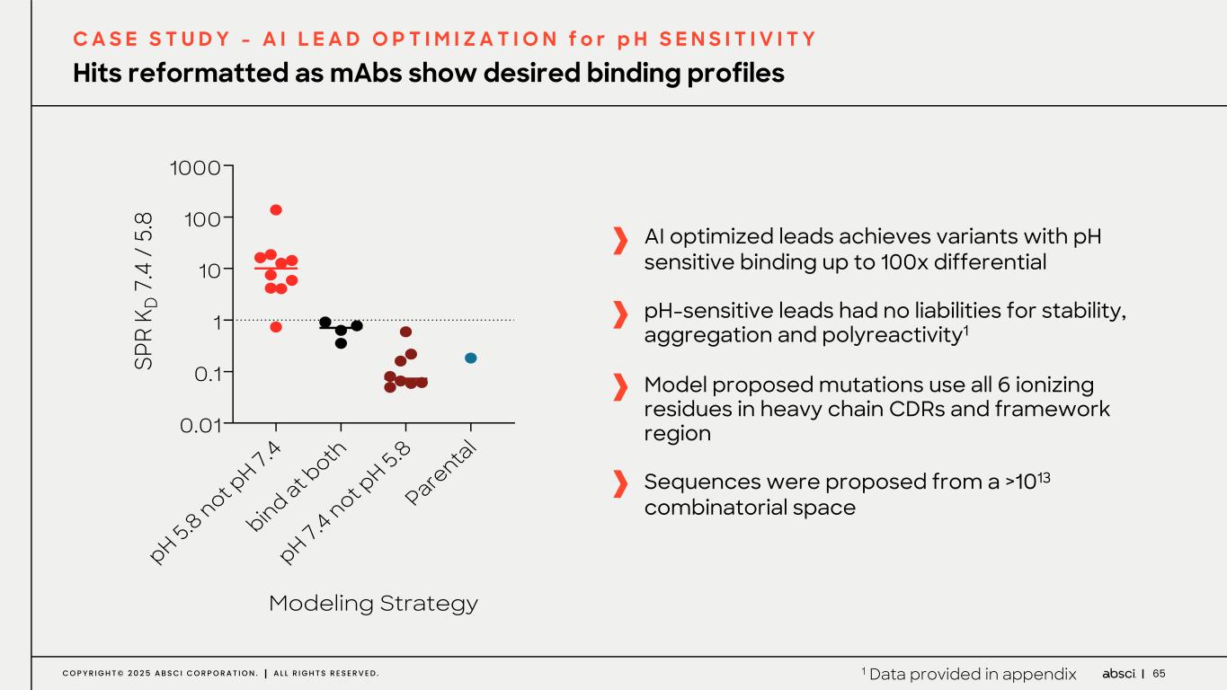 64C O P Y R I G H T © 2 0 2 5 A B S C I C O R P O R A T I O N . A L L R I G H T S R E S E R V E D . Models identify pH sensitive Fab variants from the same lead for either indication C A S E S T U D Y - A I L E A D O P T I M I Z A T I O N f o r p H S E N S I T I V I T Y 1. Library for model training sampled 60 positions on heavy chain framework and CDRs with up to 7 substitutions biased for ionizable residues (H, K, R, D, E) 2. Library screened for antigen binding at pH 7.4 and pH 5.8 3. Model trained and used to generate antibodies with tuned pH dependency Pr ed ic te d bi nd in g sc or e @ p H 5 .8 Predicted binding score @ pH 7.4 AI affinity scoring of variants within a large combinatorial space SPR KD (nM) @ pH 7.4 SP R K D (n M ) @ p H 5 .8 Lab measured affinities of Fab variants predicted to have tighter binding at neutral pH Parental lead Model predictionSP R K D ( nM ) @ p H 5. 8 Lab measured affinities of Fab variants predicted to have tighter binding at low pH Parental lead Model prediction SPR KD (nM) @ pH 7.4 SP R K D (n M ) @ p H 5 .8