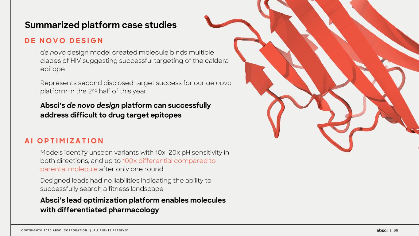 65C O P Y R I G H T © 2 0 2 5 A B S C I C O R P O R A T I O N . A L L R I G H T S R E S E R V E D . Hits reformatted as mAbs show desired binding profiles C A S E S T U D Y - A I L E A D O P T I M I Z A T I O N f o r p H S E N S I T I V I T Y AI optimized leads achieves variants with pH sensitive binding up to 100x differential pH-sensitive leads had no liabilities for stability, aggregation and polyreactivity1 Model proposed mutations use all 6 ionizing residues in heavy chain CDRs and framework region Sequences were proposed from a >1013 combinatorial space pH 5.8 not p H 7.4 bind at b oth pH 7.4 not p H 5.8 Pare ntal 0.01 0.1 1 10 100 1000 Modeling Strategy SP R K D 7 .4 / 5. 8 1 Data provided in appendix