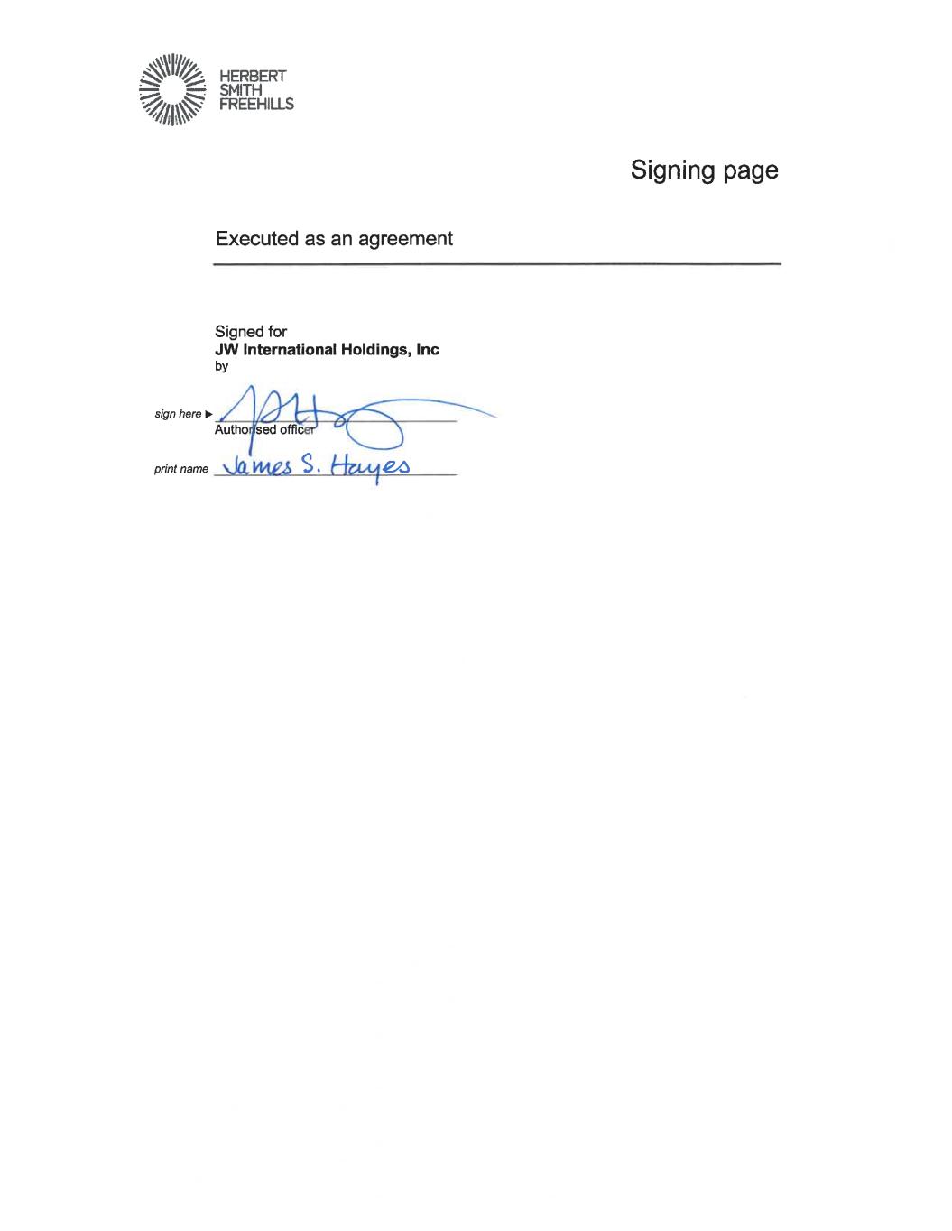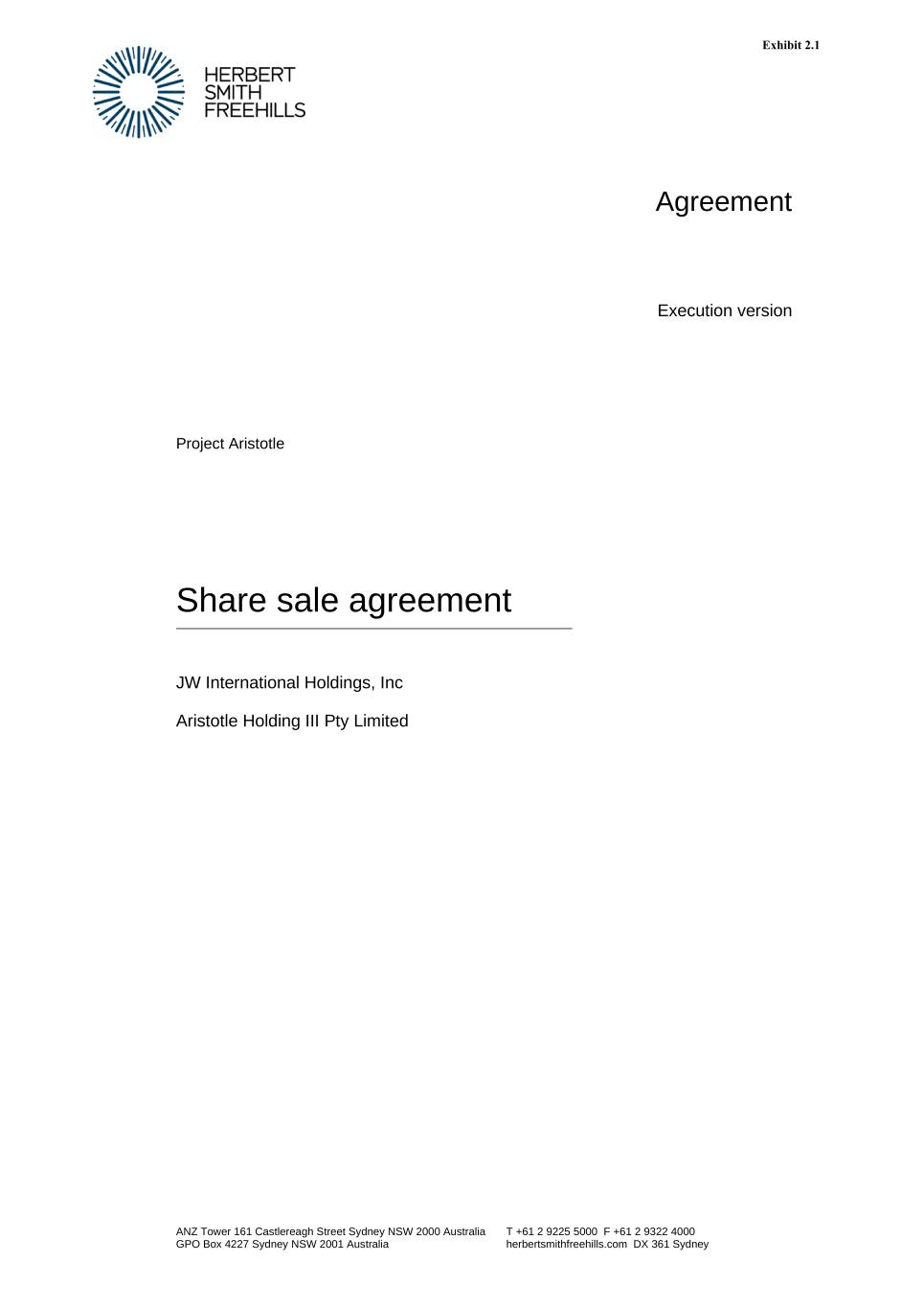 ANZ Tower 161 Castlereagh Street Sydney NSW 2000 Australia GPO Box 4227 Sydney NSW 2001 Australia T +61 2 9225 5000 F +61 2 9322 4000 herbertsmithfreehills.com DX 361 Sydney Agreement Execution version Project Aristotle Share sale agreement JW International Holdings, Inc Aristotle Holding III Pty Limited Exhibit 2.1