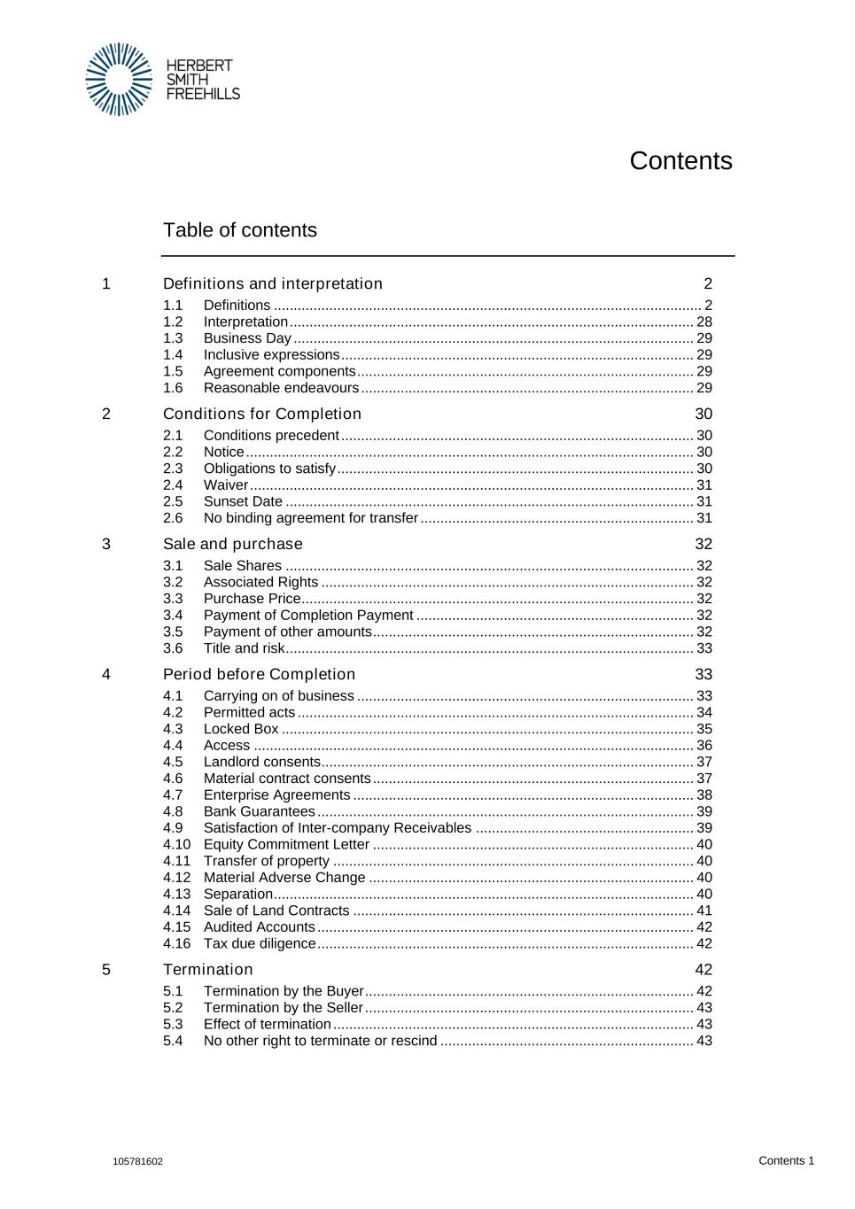 105781602 Contents 1 Contents Table of contents 1 Definitions and interpretation 2 1.1 Definitions ............................................................................................................ 2 1.2 Interpretation ...................................................................................................... 28 1.3 Business Day ..................................................................................................... 29 1.4 Inclusive expressions ......................................................................................... 29 1.5 Agreement components ..................................................................................... 29 1.6 Reasonable endeavours .................................................................................... 29 2 Conditions for Completion 30 2.1 Conditions precedent ......................................................................................... 30 2.2 Notice ................................................................................................................. 30 2.3 Obligations to satisfy .......................................................................................... 30 2.4 Waiver ................................................................................................................ 31 2.5 Sunset Date ....................................................................................................... 31 2.6 No binding agreement for transfer ..................................................................... 31 3 Sale and purchase 32 3.1 Sale Shares ....................................................................................................... 32 3.2 Associated Rights .............................................................................................. 32 3.3 Purchase Price ................................................................................................... 32 3.4 Payment of Completion Payment ...................................................................... 32 3.5 Payment of other amounts ................................................................................. 32 3.6 Title and risk ....................................................................................................... 33 4 Period before Completion 33 4.1 Carrying on of business ..................................................................................... 33 4.2 Permitted acts .................................................................................................... 34 4.3 Locked Box ........................................................................................................ 35 4.4 Access ............................................................................................................... 36 4.5 Landlord consents.............................................................................................. 37 4.6 Material contract consents ................................................................................. 37 4.7 Enterprise Agreements ...................................................................................... 38 4.8 Bank Guarantees ............................................................................................... 39 4.9 Satisfaction of Inter-company Receivables ....................................................... 39 4.10 Equity Commitment Letter ................................................................................. 40 4.11 Transfer of property ........................................................................................... 40 4.12 Material Adverse Change .................................................................................. 40 4.13 Separation .......................................................................................................... 40 4.14 Sale of Land Contracts ...................................................................................... 41 4.15 Audited Accounts ............................................................................................... 42 4.16 Tax due diligence ............................................................................................... 42 5 Termination 42 5.1 Termination by the Buyer ................................................................................... 42 5.2 Termination by the Seller ................................................................................... 43 5.3 Effect of termination ........................................................................................... 43 5.4 No other right to terminate or rescind ................................................................ 43
