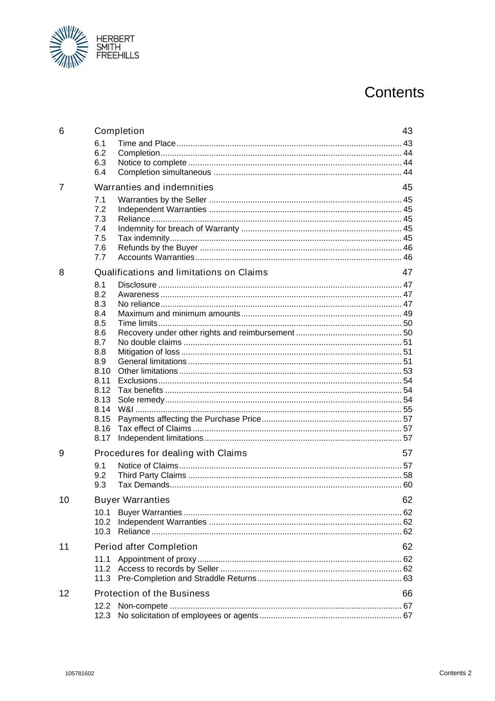 Contents 105781602 Contents 2 6 Completion 43 6.1 Time and Place .................................................................................................. 43 6.2 Completion ......................................................................................................... 44 6.3 Notice to complete ............................................................................................. 44 6.4 Completion simultaneous .................................................................................. 44 7 Warranties and indemnities 45 7.1 Warranties by the Seller .................................................................................... 45 7.2 Independent Warranties .................................................................................... 45 7.3 Reliance ............................................................................................................. 45 7.4 Indemnity for breach of Warranty ...................................................................... 45 7.5 Tax indemnity ..................................................................................................... 45 7.6 Refunds by the Buyer ........................................................................................ 46 7.7 Accounts Warranties .......................................................................................... 46 8 Qualifications and limitations on Claims 47 8.1 Disclosure .......................................................................................................... 47 8.2 Awareness ......................................................................................................... 47 8.3 No reliance ......................................................................................................... 47 8.4 Maximum and minimum amounts ...................................................................... 49 8.5 Time limits .......................................................................................................... 50 8.6 Recovery under other rights and reimbursement .............................................. 50 8.7 No double claims ............................................................................................... 51 8.8 Mitigation of loss ................................................................................................ 51 8.9 General limitations ............................................................................................. 51 8.10 Other limitations ................................................................................................. 53 8.11 Exclusions .......................................................................................................... 54 8.12 Tax benefits ....................................................................................................... 54 8.13 Sole remedy ....................................................................................................... 54 8.14 W&I .................................................................................................................... 55 8.15 Payments affecting the Purchase Price ............................................................. 57 8.16 Tax effect of Claims ........................................................................................... 57 8.17 Independent limitations ...................................................................................... 57 9 Procedures for dealing with Claims 57 9.1 Notice of Claims ................................................................................................. 57 9.2 Third Party Claims ............................................................................................. 58 9.3 Tax Demands ..................................................................................................... 60 10 Buyer Warranties 62 10.1 Buyer Warranties ............................................................................................... 62 10.2 Independent Warranties .................................................................................... 62 10.3 Reliance ............................................................................................................. 62 11 Period after Completion 62 11.1 Appointment of proxy ......................................................................................... 62 11.2 Access to records by Seller ............................................................................... 62 11.3 Pre-Completion and Straddle Returns ............................................................... 63 12 Protection of the Business 66 12.2 Non-compete ..................................................................................................... 67 12.3 No solicitation of employees or agents .............................................................. 67