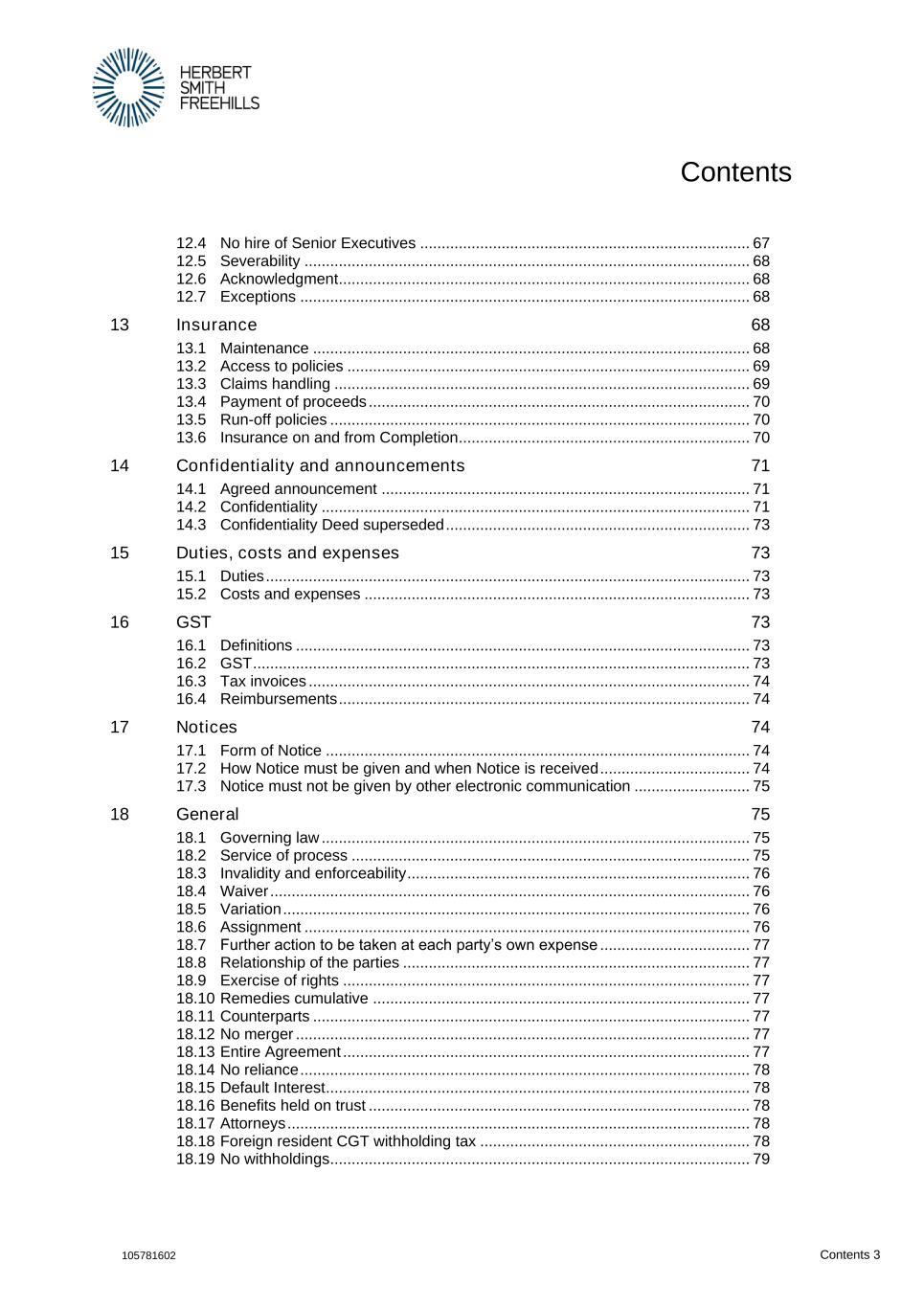 Contents 105781602 Contents 3 12.4 No hire of Senior Executives ............................................................................. 67 12.5 Severability ........................................................................................................ 68 12.6 Acknowledgment................................................................................................ 68 12.7 Exceptions ......................................................................................................... 68 13 Insurance 68 13.1 Maintenance ...................................................................................................... 68 13.2 Access to policies .............................................................................................. 69 13.3 Claims handling ................................................................................................. 69 13.4 Payment of proceeds ......................................................................................... 70 13.5 Run-off policies .................................................................................................. 70 13.6 Insurance on and from Completion.................................................................... 70 14 Confidentiality and announcements 71 14.1 Agreed announcement ...................................................................................... 71 14.2 Confidentiality .................................................................................................... 71 14.3 Confidentiality Deed superseded ....................................................................... 73 15 Duties, costs and expenses 73 15.1 Duties ................................................................................................................. 73 15.2 Costs and expenses .......................................................................................... 73 16 GST 73 16.1 Definitions .......................................................................................................... 73 16.2 GST .................................................................................................................... 73 16.3 Tax invoices ....................................................................................................... 74 16.4 Reimbursements ................................................................................................ 74 17 Notices 74 17.1 Form of Notice ................................................................................................... 74 17.2 How Notice must be given and when Notice is received ................................... 74 17.3 Notice must not be given by other electronic communication ........................... 75 18 General 75 18.1 Governing law .................................................................................................... 75 18.2 Service of process ............................................................................................. 75 18.3 Invalidity and enforceability ................................................................................ 76 18.4 Waiver ................................................................................................................ 76 18.5 Variation ............................................................................................................. 76 18.6 Assignment ........................................................................................................ 76 18.7 Further action to be taken at each party’s own expense ................................... 77 18.8 Relationship of the parties ................................................................................. 77 18.9 Exercise of rights ............................................................................................... 77 18.10 Remedies cumulative ........................................................................................ 77 18.11 Counterparts ...................................................................................................... 77 18.12 No merger .......................................................................................................... 77 18.13 Entire Agreement ............................................................................................... 77 18.14 No reliance ......................................................................................................... 78 18.15 Default Interest ................................................................................................... 78 18.16 Benefits held on trust ......................................................................................... 78 18.17 Attorneys ............................................................................................................ 78 18.18 Foreign resident CGT withholding tax ............................................................... 78 18.19 No withholdings .................................................................................................. 79