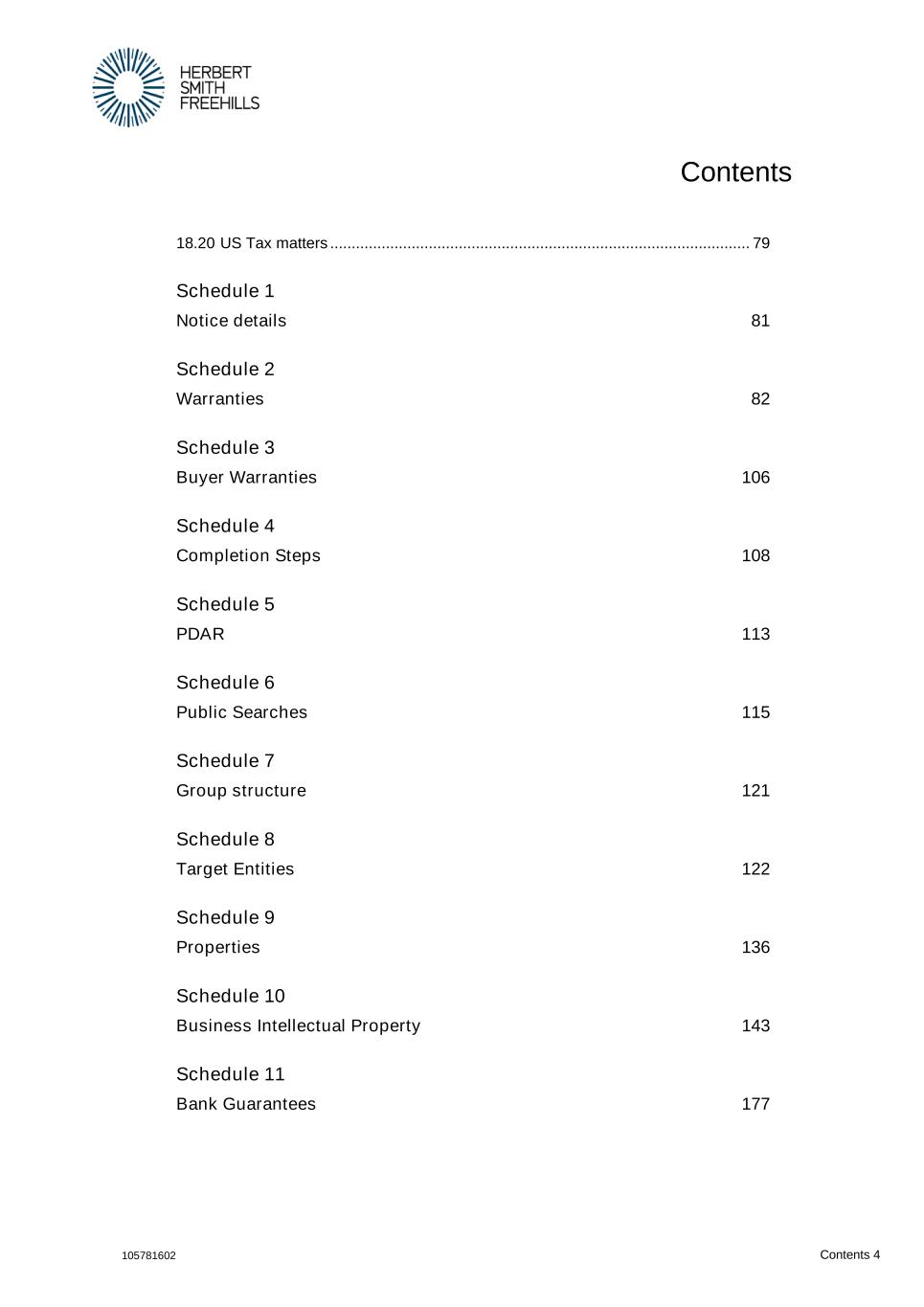 Contents 105781602 Contents 4 18.20 US Tax matters .................................................................................................. 79 Schedule 1 Notice details 81 Schedule 2 Warranties 82 Schedule 3 Buyer Warranties 106 Schedule 4 Completion Steps 108 Schedule 5 PDAR 113 Schedule 6 Public Searches 115 Schedule 7 Group structure 121 Schedule 8 Target Entities 122 Schedule 9 Properties 136 Schedule 10 Business Intellectual Property 143 Schedule 11 Bank Guarantees 177