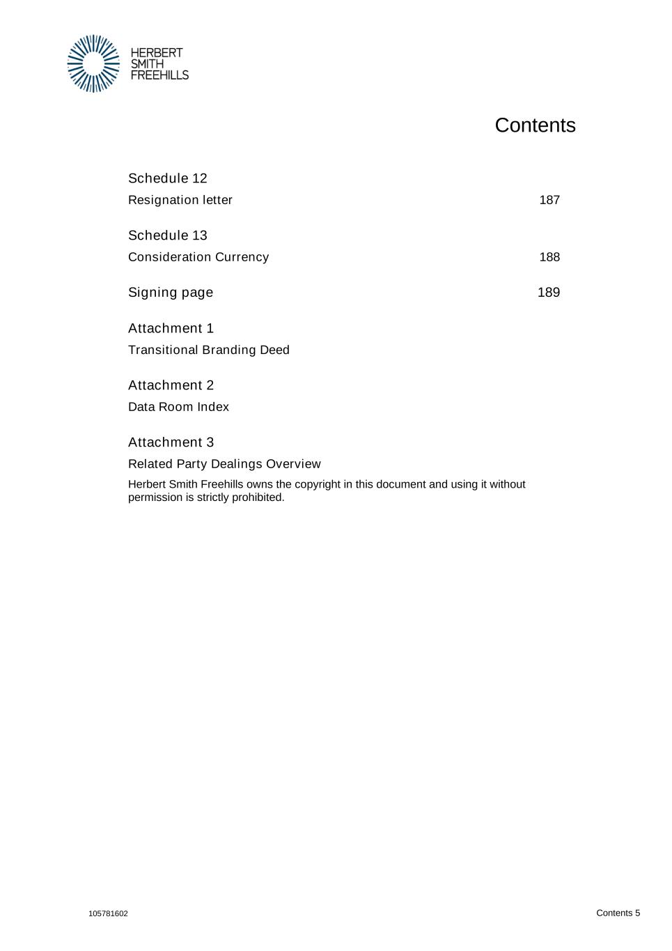 Contents 105781602 Contents 5 Schedule 12 Resignation letter 187 Schedule 13 Consideration Currency 188 Signing page 189 Attachment 1 Transitional Branding Deed Attachment 2 Data Room Index Attachment 3 Related Party Dealings Overview Herbert Smith Freehills owns the copyright in this document and using it without permission is strictly prohibited.
