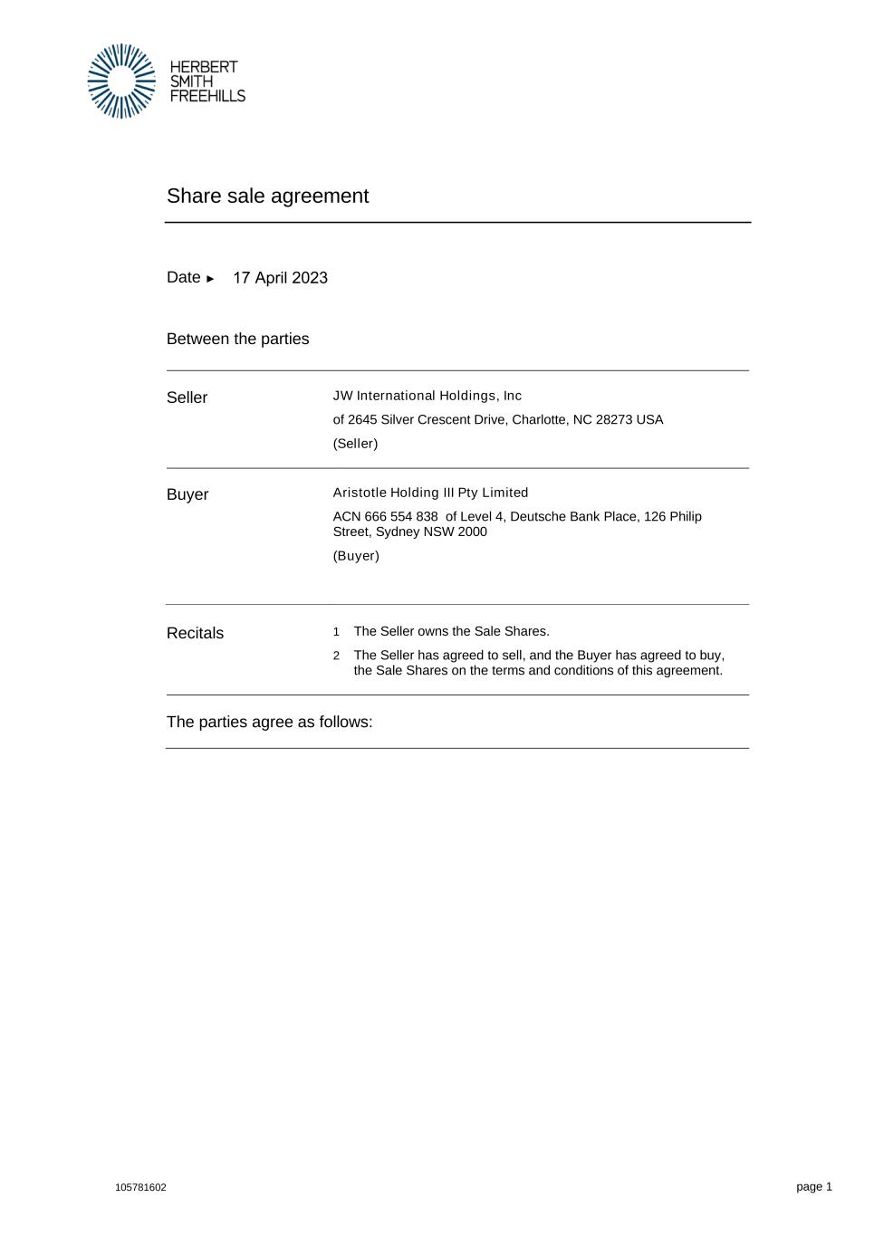 105781602 page 1 Share sale agreement Date ► Between the parties Seller JW International Holdings, Inc of 2645 Silver Crescent Drive, Charlotte, NC 28273 USA (Seller) Buyer Aristotle Holding III Pty Limited ACN 666 554 838 of Level 4, Deutsche Bank Place, 126 Philip Street, Sydney NSW 2000 (Buyer) Recitals 1 The Seller owns the Sale Shares. 2 The Seller has agreed to sell, and the Buyer has agreed to buy, the Sale Shares on the terms and conditions of this agreement. The parties agree as follows: 17 April 2023