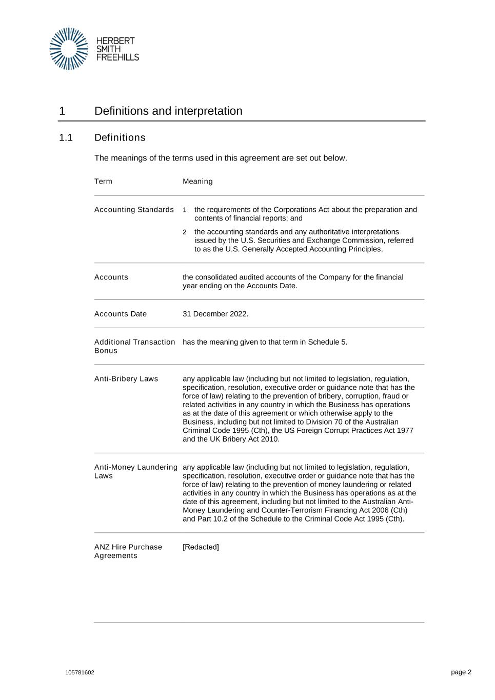 105781602 page 2 1 Definitions and interpretation 1.1 Definitions The meanings of the terms used in this agreement are set out below. Term Meaning Accounting Standards 1 the requirements of the Corporations Act about the preparation and contents of financial reports; and 2 the accounting standards and any authoritative interpretations issued by the U.S. Securities and Exchange Commission, referred to as the U.S. Generally Accepted Accounting Principles. Accounts the consolidated audited accounts of the Company for the financial year ending on the Accounts Date. Accounts Date 31 December 2022. Additional Transaction Bonus has the meaning given to that term in Schedule 5. Anti-Bribery Laws any applicable law (including but not limited to legislation, regulation, specification, resolution, executive order or guidance note that has the force of law) relating to the prevention of bribery, corruption, fraud or related activities in any country in which the Business has operations as at the date of this agreement or which otherwise apply to the Business, including but not limited to Division 70 of the Australian Criminal Code 1995 (Cth), the US Foreign Corrupt Practices Act 1977 and the UK Bribery Act 2010. Anti-Money Laundering Laws any applicable law (including but not limited to legislation, regulation, specification, resolution, executive order or guidance note that has the force of law) relating to the prevention of money laundering or related activities in any country in which the Business has operations as at the date of this agreement, including but not limited to the Australian Anti- Money Laundering and Counter-Terrorism Financing Act 2006 (Cth) and Part 10.2 of the Schedule to the Criminal Code Act 1995 (Cth). ANZ Hire Purchase Agreements [Redacted]