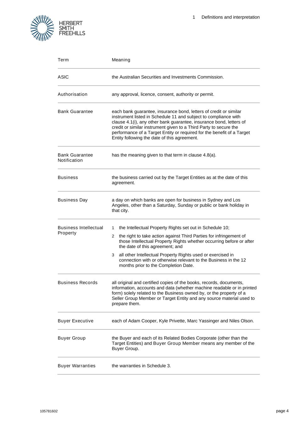 1 Definitions and interpretation 105781602 page 4 Term Meaning ASIC the Australian Securities and Investments Commission. Authorisation any approval, licence, consent, authority or permit. Bank Guarantee each bank guarantee, insurance bond, letters of credit or similar instrument listed in Schedule 11 and subject to compliance with clause 4.1(i), any other bank guarantee, insurance bond, letters of credit or similar instrument given to a Third Party to secure the performance of a Target Entity or required for the benefit of a Target Entity following the date of this agreement. Bank Guarantee Notification has the meaning given to that term in clause 4.8(a). Business the business carried out by the Target Entities as at the date of this agreement. Business Day a day on which banks are open for business in Sydney and Los Angeles, other than a Saturday, Sunday or public or bank holiday in that city. Business Intellectual Property 1 the Intellectual Property Rights set out in Schedule 10; 2 the right to take action against Third Parties for infringement of those Intellectual Property Rights whether occurring before or after the date of this agreement; and 3 all other Intellectual Property Rights used or exercised in connection with or otherwise relevant to the Business in the 12 months prior to the Completion Date. Business Records all original and certified copies of the books, records, documents, information, accounts and data (whether machine readable or in printed form) solely related to the Business owned by, or the property of a Seller Group Member or Target Entity and any source material used to prepare them. Buyer Executive each of Adam Cooper, Kyle Privette, Marc Yassinger and Niles Olson. Buyer Group the Buyer and each of its Related Bodies Corporate (other than the Target Entities) and Buyer Group Member means any member of the Buyer Group. Buyer Warranties the warranties in Schedule 3.