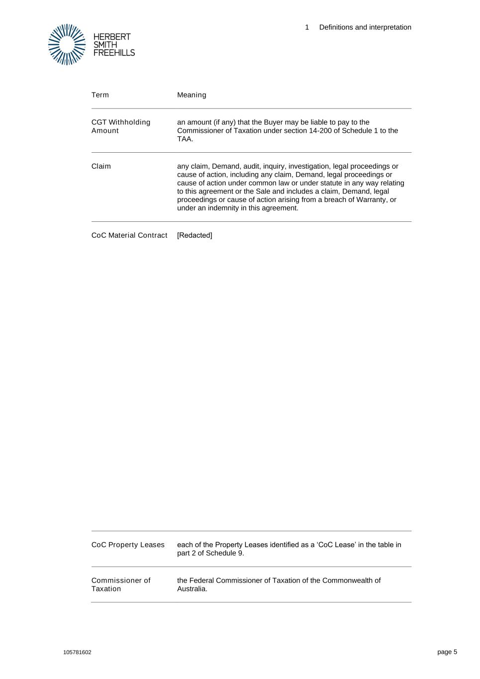 1 Definitions and interpretation 105781602 page 5 Term Meaning CGT Withholding Amount an amount (if any) that the Buyer may be liable to pay to the Commissioner of Taxation under section 14-200 of Schedule 1 to the TAA. Claim any claim, Demand, audit, inquiry, investigation, legal proceedings or cause of action, including any claim, Demand, legal proceedings or cause of action under common law or under statute in any way relating to this agreement or the Sale and includes a claim, Demand, legal proceedings or cause of action arising from a breach of Warranty, or under an indemnity in this agreement. CoC Material Contract [Redacted] CoC Property Leases each of the Property Leases identified as a ‘CoC Lease’ in the table in part 2 of Schedule 9. Commissioner of Taxation the Federal Commissioner of Taxation of the Commonwealth of Australia.