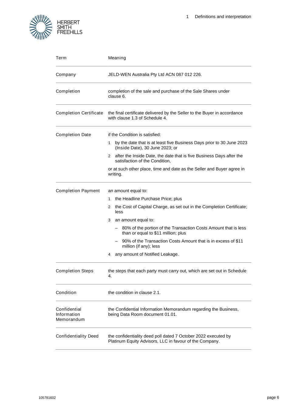 1 Definitions and interpretation 105781602 page 6 Term Meaning Company JELD-WEN Australia Pty Ltd ACN 087 012 226. Completion completion of the sale and purchase of the Sale Shares under clause 6. Completion Certificate the final certificate delivered by the Seller to the Buyer in accordance with clause 1.3 of Schedule 4. Completion Date if the Condition is satisfied: 1 by the date that is at least five Business Days prior to 30 June 2023 (Inside Date), 30 June 2023; or 2 after the Inside Date, the date that is five Business Days after the satisfaction of the Condition, or at such other place, time and date as the Seller and Buyer agree in writing. Completion Payment an amount equal to: 1 the Headline Purchase Price; plus 2 the Cost of Capital Charge, as set out in the Completion Certificate; less 3 an amount equal to: – 80% of the portion of the Transaction Costs Amount that is less than or equal to $11 million; plus – 90% of the Transaction Costs Amount that is in excess of $11 million (if any); less 4 any amount of Notified Leakage. Completion Steps the steps that each party must carry out, which are set out in Schedule 4. Condition the condition in clause 2.1. Confidential Information Memorandum the Confidential Information Memorandum regarding the Business, being Data Room document 01.01. Confidentiality Deed the confidentiality deed poll dated 7 October 2022 executed by Platinum Equity Advisors, LLC in favour of the Company.