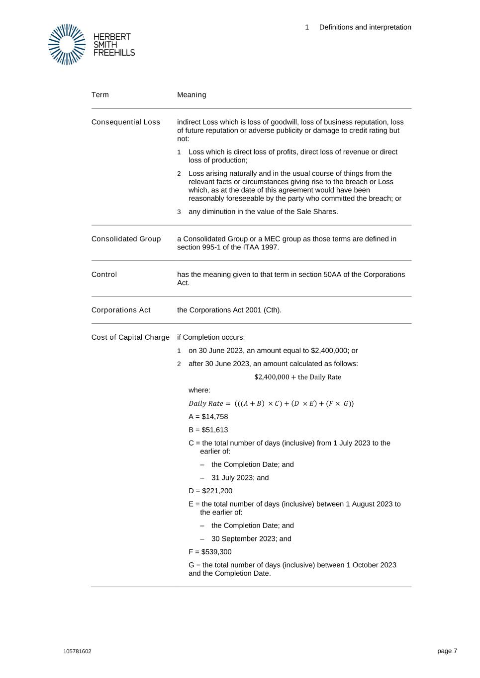 1 Definitions and interpretation 105781602 page 7 Term Meaning Consequential Loss indirect Loss which is loss of goodwill, loss of business reputation, loss of future reputation or adverse publicity or damage to credit rating but not: 1 Loss which is direct loss of profits, direct loss of revenue or direct loss of production; 2 Loss arising naturally and in the usual course of things from the relevant facts or circumstances giving rise to the breach or Loss which, as at the date of this agreement would have been reasonably foreseeable by the party who committed the breach; or 3 any diminution in the value of the Sale Shares. Consolidated Group a Consolidated Group or a MEC group as those terms are defined in section 995-1 of the ITAA 1997. Control has the meaning given to that term in section 50AA of the Corporations Act. Corporations Act the Corporations Act 2001 (Cth). Cost of Capital Charge if Completion occurs: 1 on 30 June 2023, an amount equal to $2,400,000; or 2 after 30 June 2023, an amount calculated as follows: $2,400,000 + the Daily Rate where: 𝐷𝑎𝑖𝑙𝑦 𝑅𝑎𝑡𝑒 = (((𝐴 + 𝐵) × 𝐶) + (𝐷 × 𝐸) + (𝐹 × 𝐺)) A = $14,758 B = $51,613 C = the total number of days (inclusive) from 1 July 2023 to the earlier of: – the Completion Date; and – 31 July 2023; and D = $221,200 E = the total number of days (inclusive) between 1 August 2023 to the earlier of: – the Completion Date; and – 30 September 2023; and F = $539,300 G = the total number of days (inclusive) between 1 October 2023 and the Completion Date.