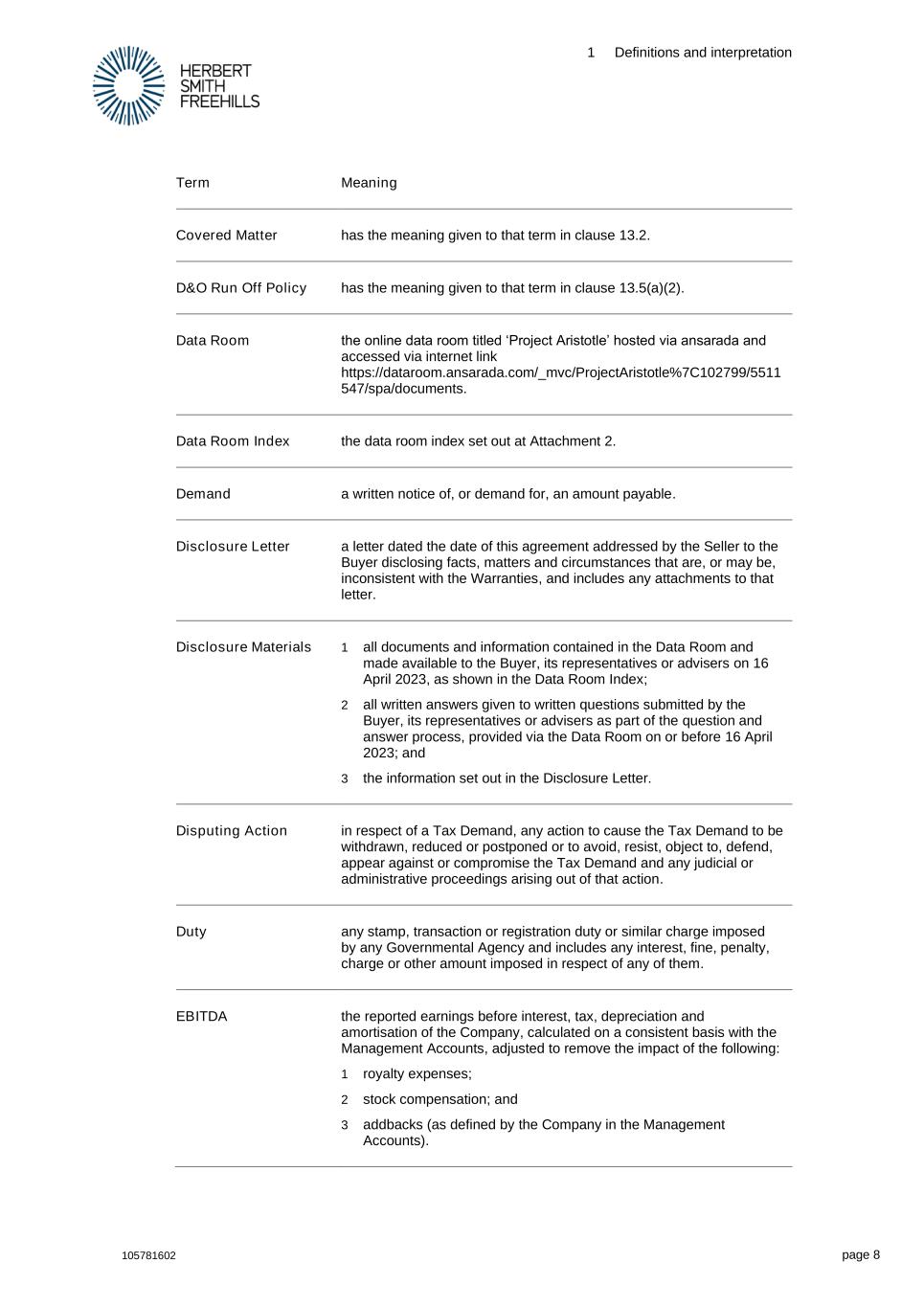 1 Definitions and interpretation 105781602 page 8 Term Meaning Covered Matter has the meaning given to that term in clause 13.2. D&O Run Off Policy has the meaning given to that term in clause 13.5(a)(2). Data Room the online data room titled ‘Project Aristotle’ hosted via ansarada and accessed via internet link https://dataroom.ansarada.com/_mvc/ProjectAristotle%7C102799/5511 547/spa/documents. Data Room Index the data room index set out at Attachment 2. Demand a written notice of, or demand for, an amount payable. Disclosure Letter a letter dated the date of this agreement addressed by the Seller to the Buyer disclosing facts, matters and circumstances that are, or may be, inconsistent with the Warranties, and includes any attachments to that letter. Disclosure Materials 1 all documents and information contained in the Data Room and made available to the Buyer, its representatives or advisers on 16 April 2023, as shown in the Data Room Index; 2 all written answers given to written questions submitted by the Buyer, its representatives or advisers as part of the question and answer process, provided via the Data Room on or before 16 April 2023; and 3 the information set out in the Disclosure Letter. Disputing Action in respect of a Tax Demand, any action to cause the Tax Demand to be withdrawn, reduced or postponed or to avoid, resist, object to, defend, appear against or compromise the Tax Demand and any judicial or administrative proceedings arising out of that action. Duty any stamp, transaction or registration duty or similar charge imposed by any Governmental Agency and includes any interest, fine, penalty, charge or other amount imposed in respect of any of them. EBITDA the reported earnings before interest, tax, depreciation and amortisation of the Company, calculated on a consistent basis with the Management Accounts, adjusted to remove the impact of the following: 1 royalty expenses; 2 stock compensation; and 3 addbacks (as defined by the Company in the Management Accounts).
